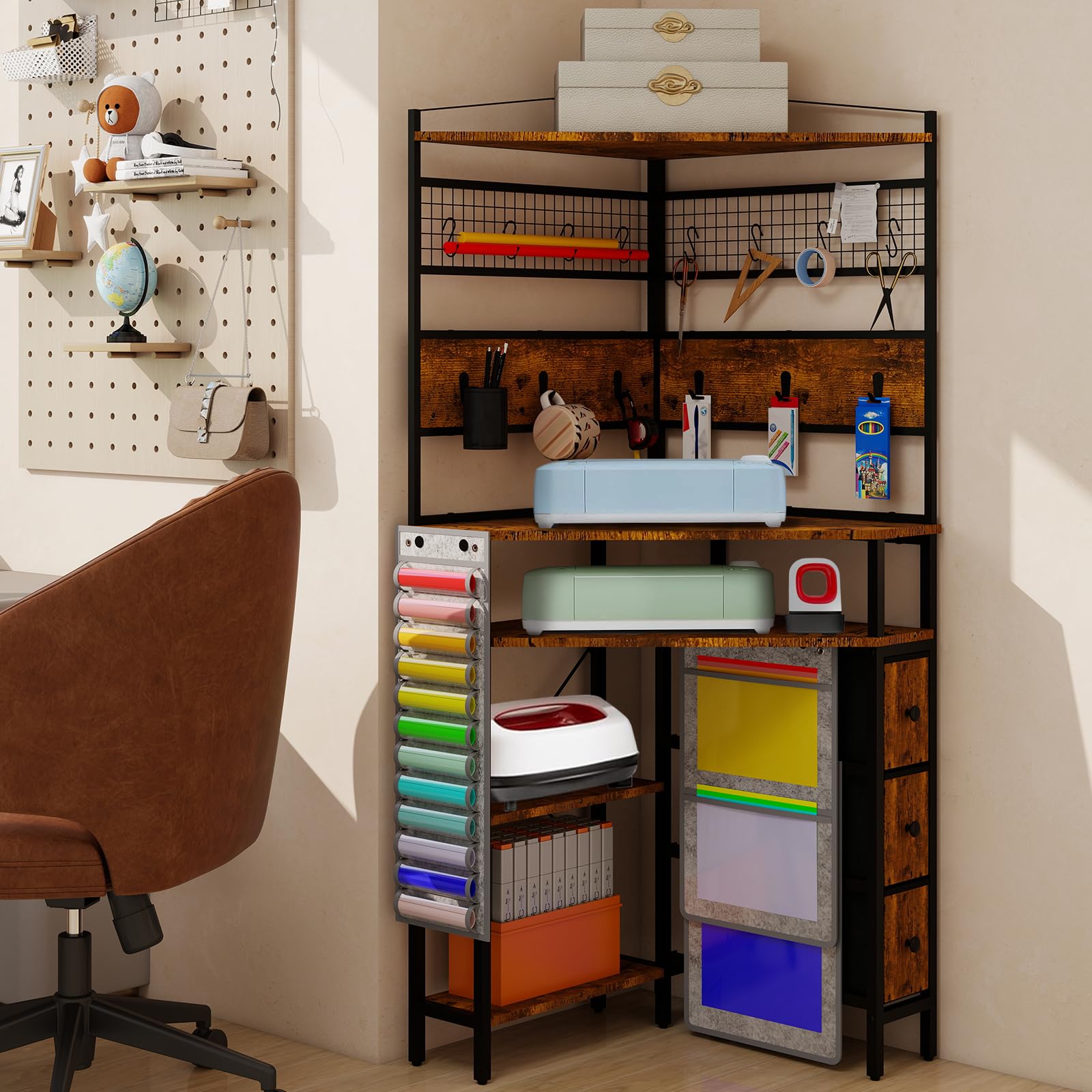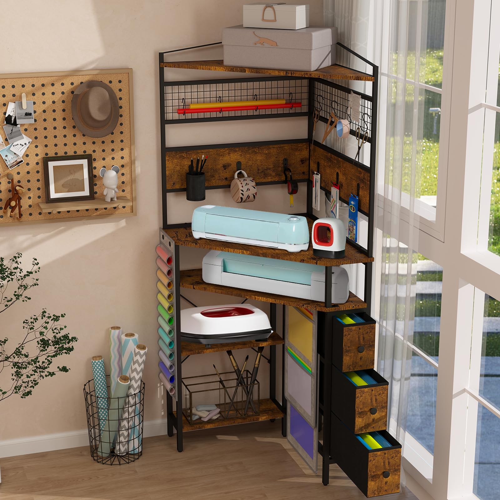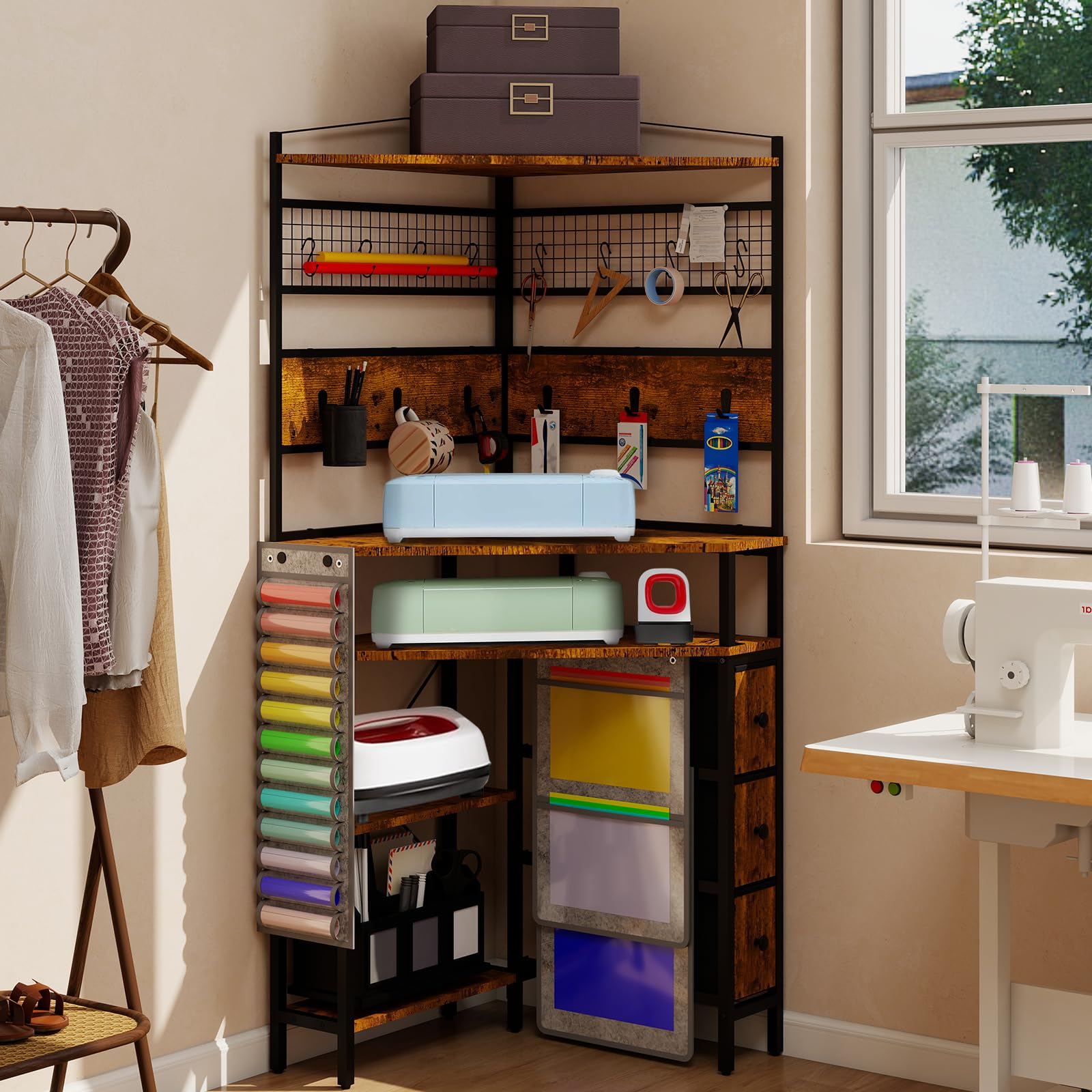 - 1. Space-Saving Corner Design + Large Work Surface Fits perfectly into any corner (29" x 8" footprint) while offering a spacious 65" tall workspace—ideal for small apartments or studios. The wide desktop holds sewing machines and fabric projects simultaneously!