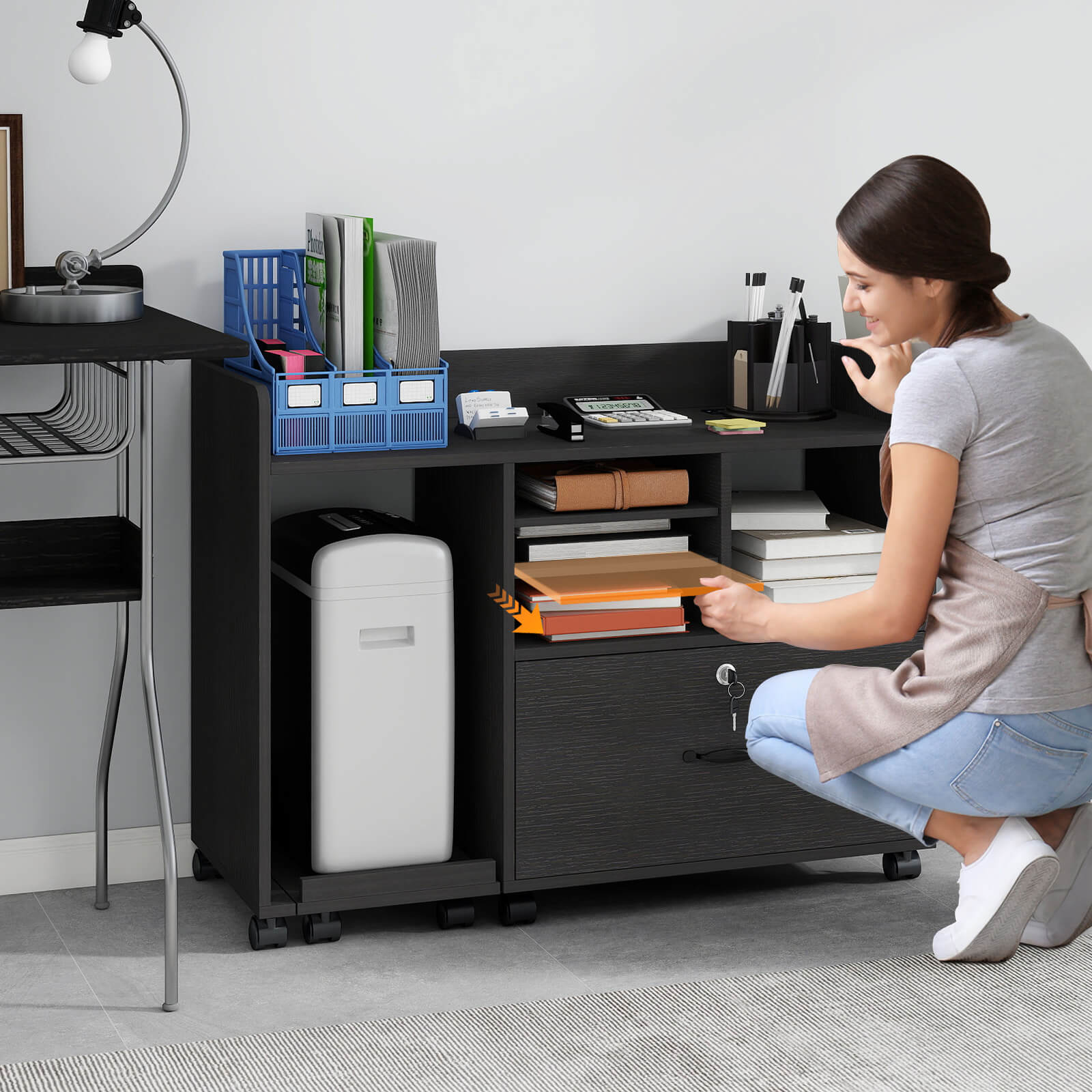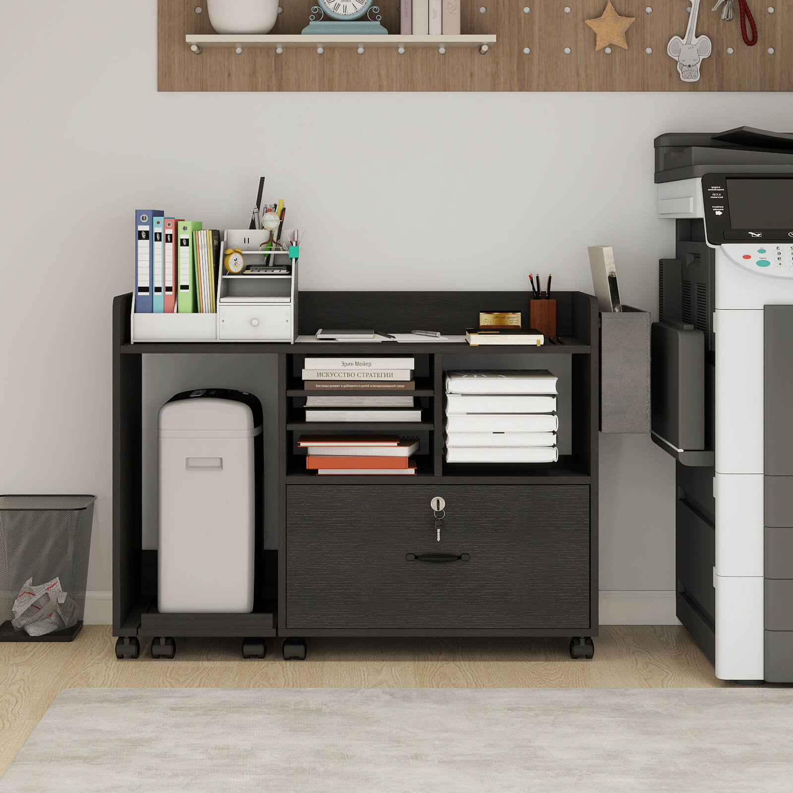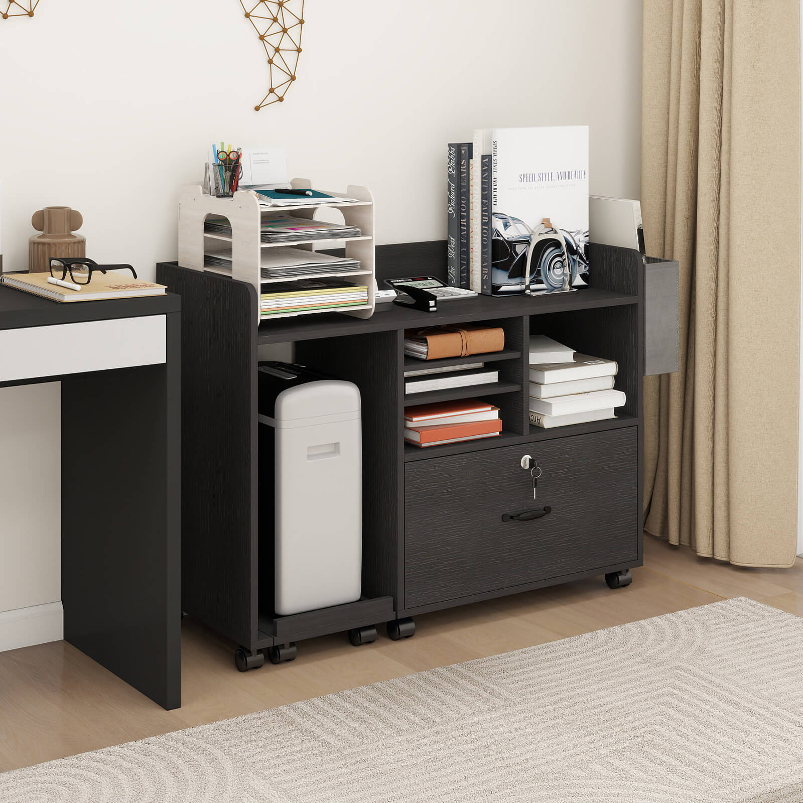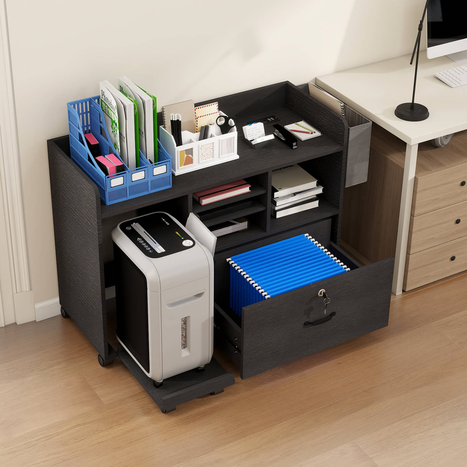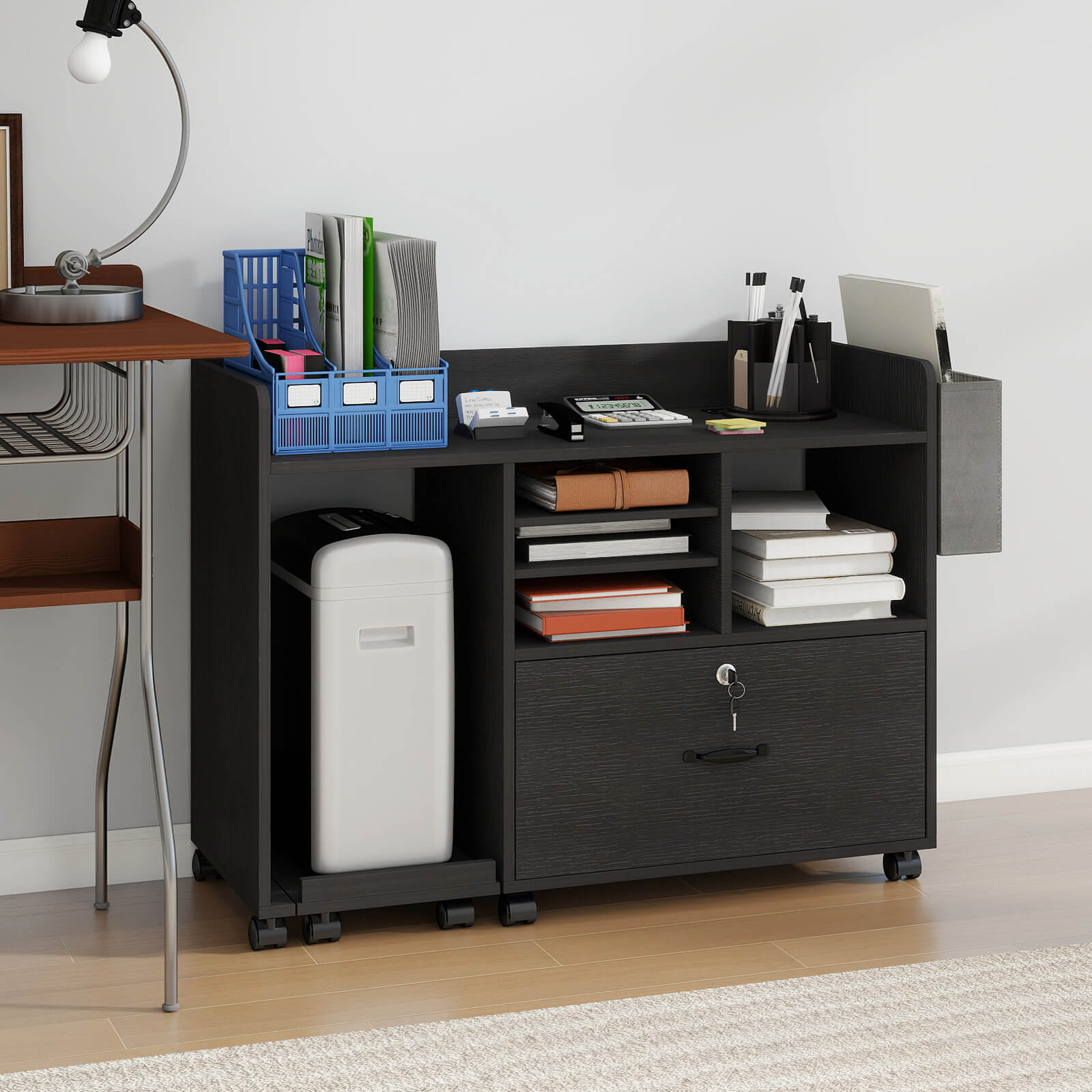 - Movable and strong stability: This rolling printer cabinet is equipped with 4 locking casters, which can be moved smoothly between rooms and can be firmly locked in place when not in use