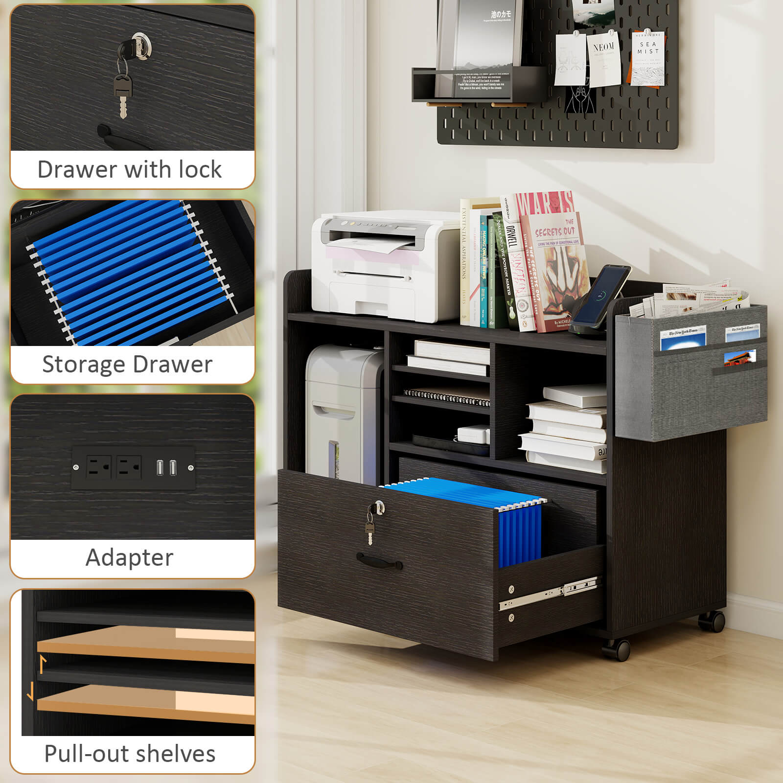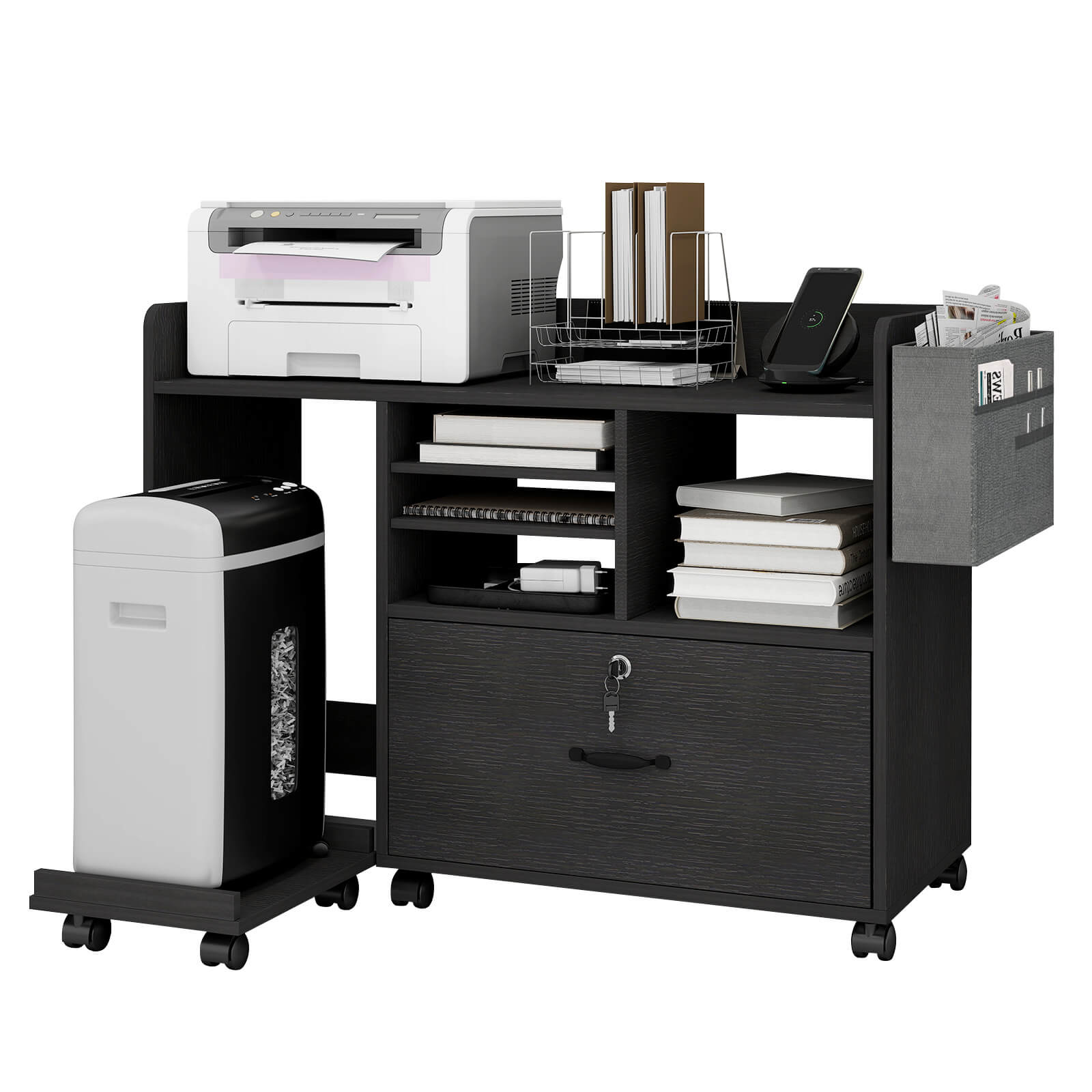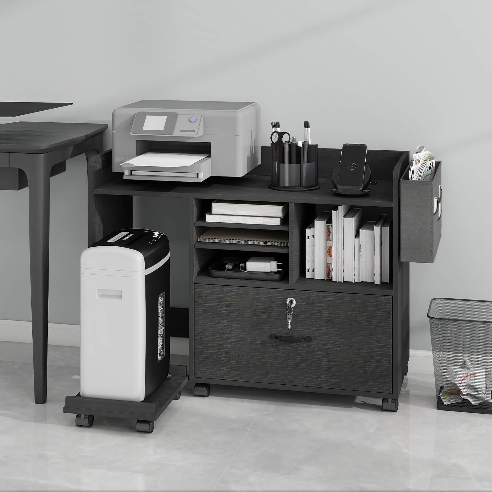 File Cabinets for Home Office Printer Stand with Storage Black Rolling Office Organizer with Lock Under Desk Filing Cabinet with Adjustable Shelves and Charging Station OC04