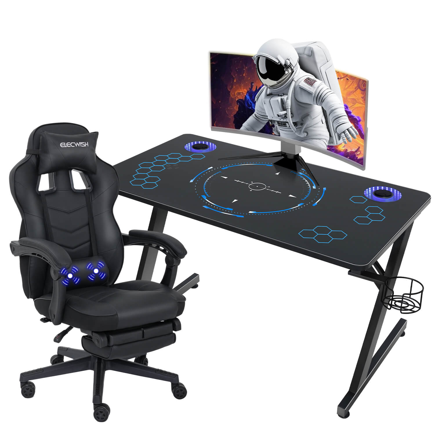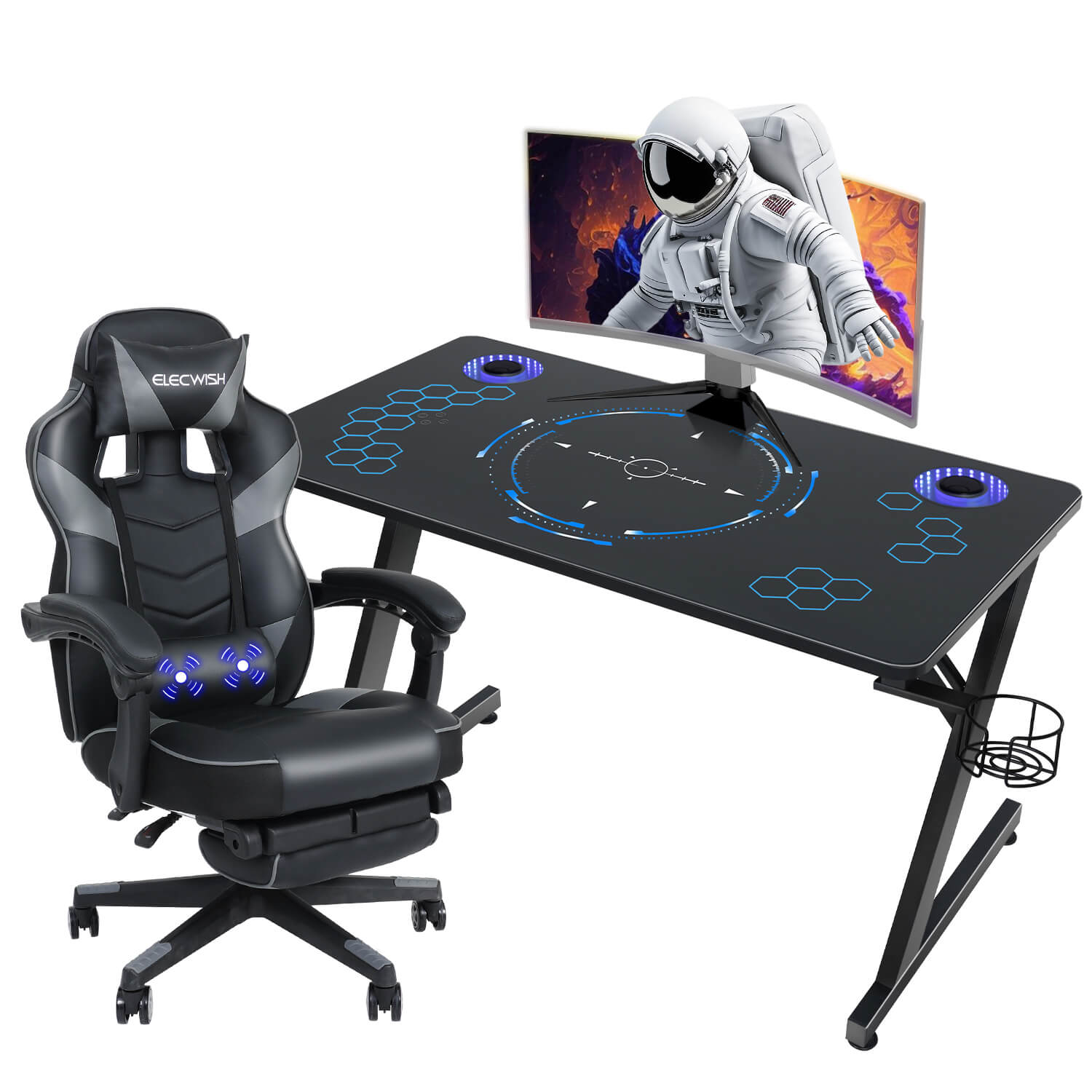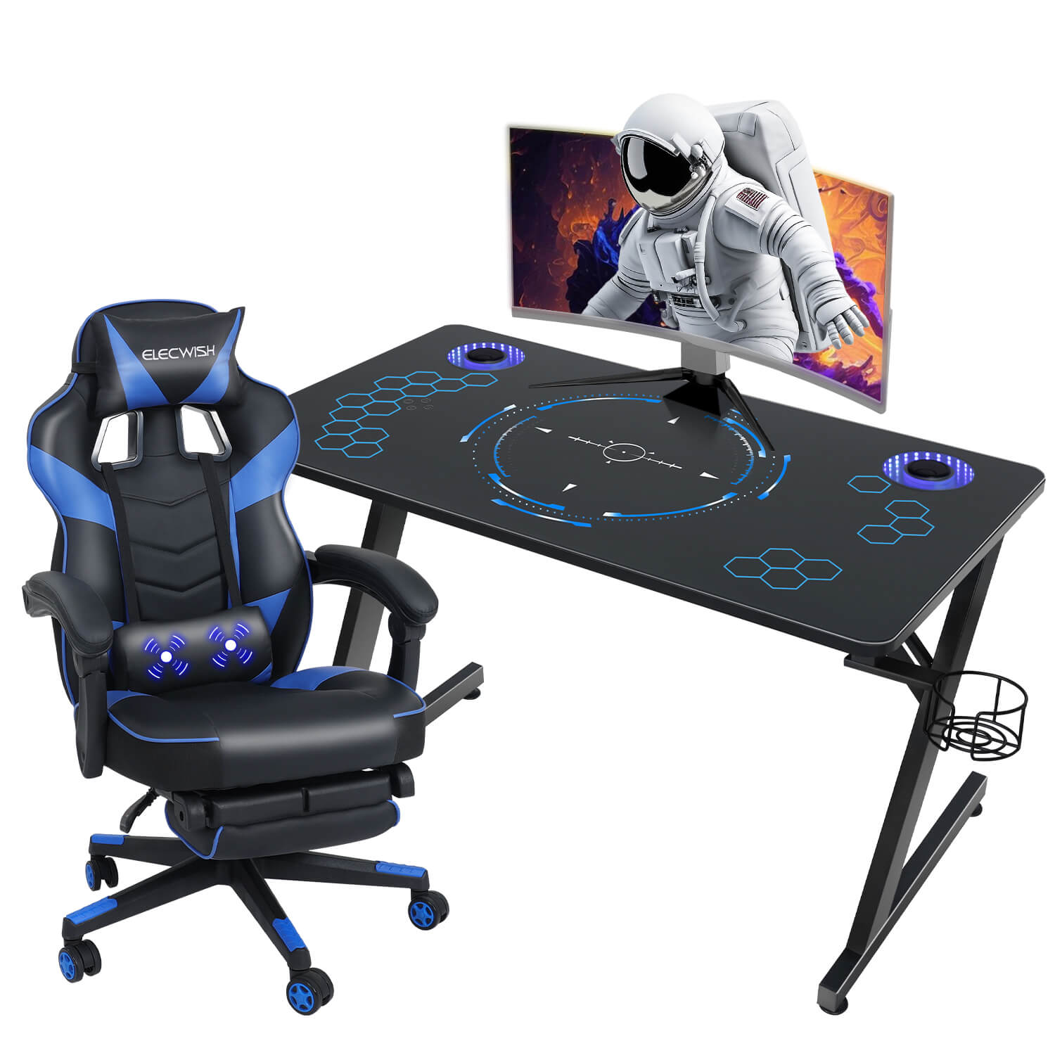This combo radiates gaming excellence! The RGB LED gaming desk is sleek and functional, and the RGB massage gaming chair is a true comfort champion. The massage feature is surprisingly effective, and the synchronized RGB lights on both pieces create a radiant gaming atmosphere. Absolutely love it!