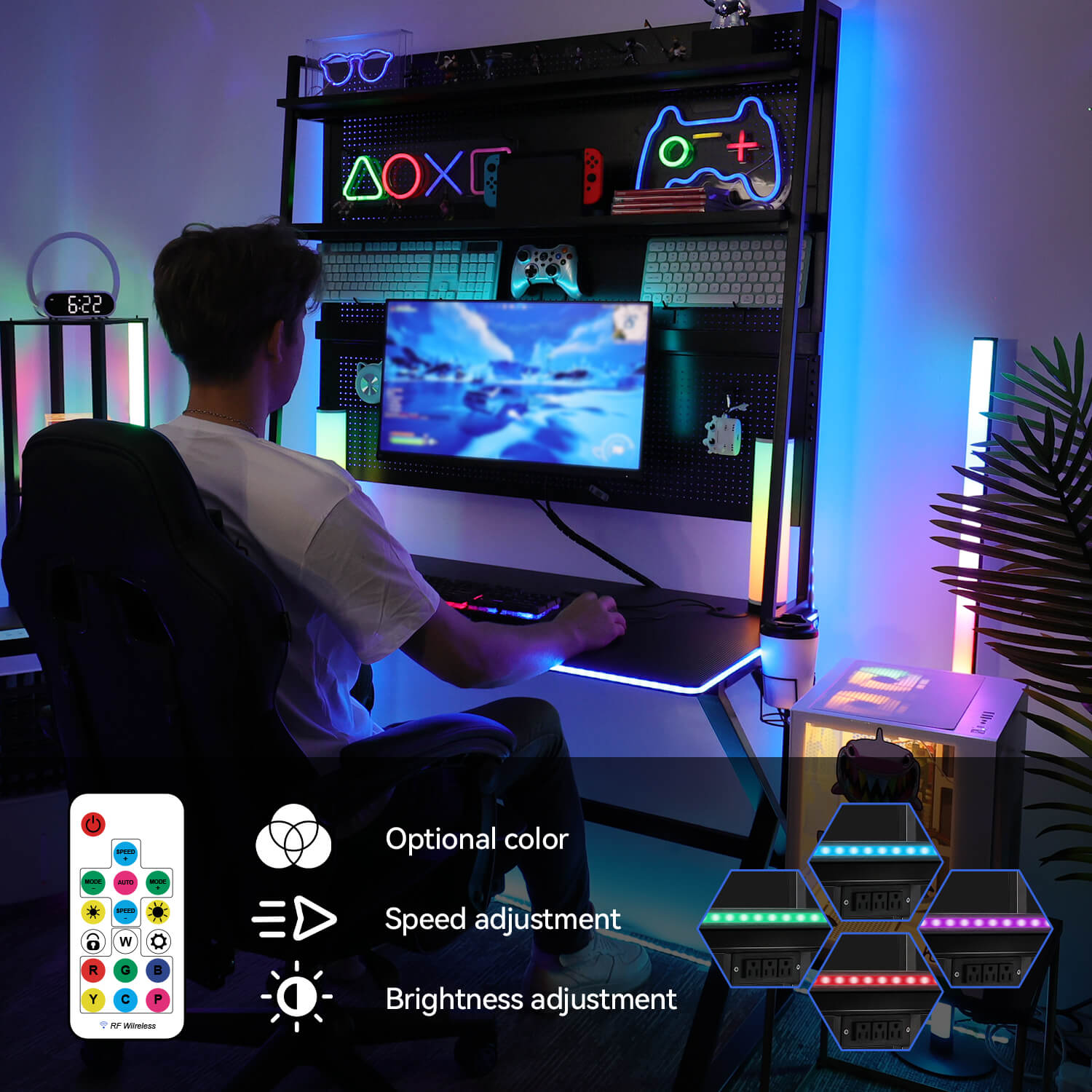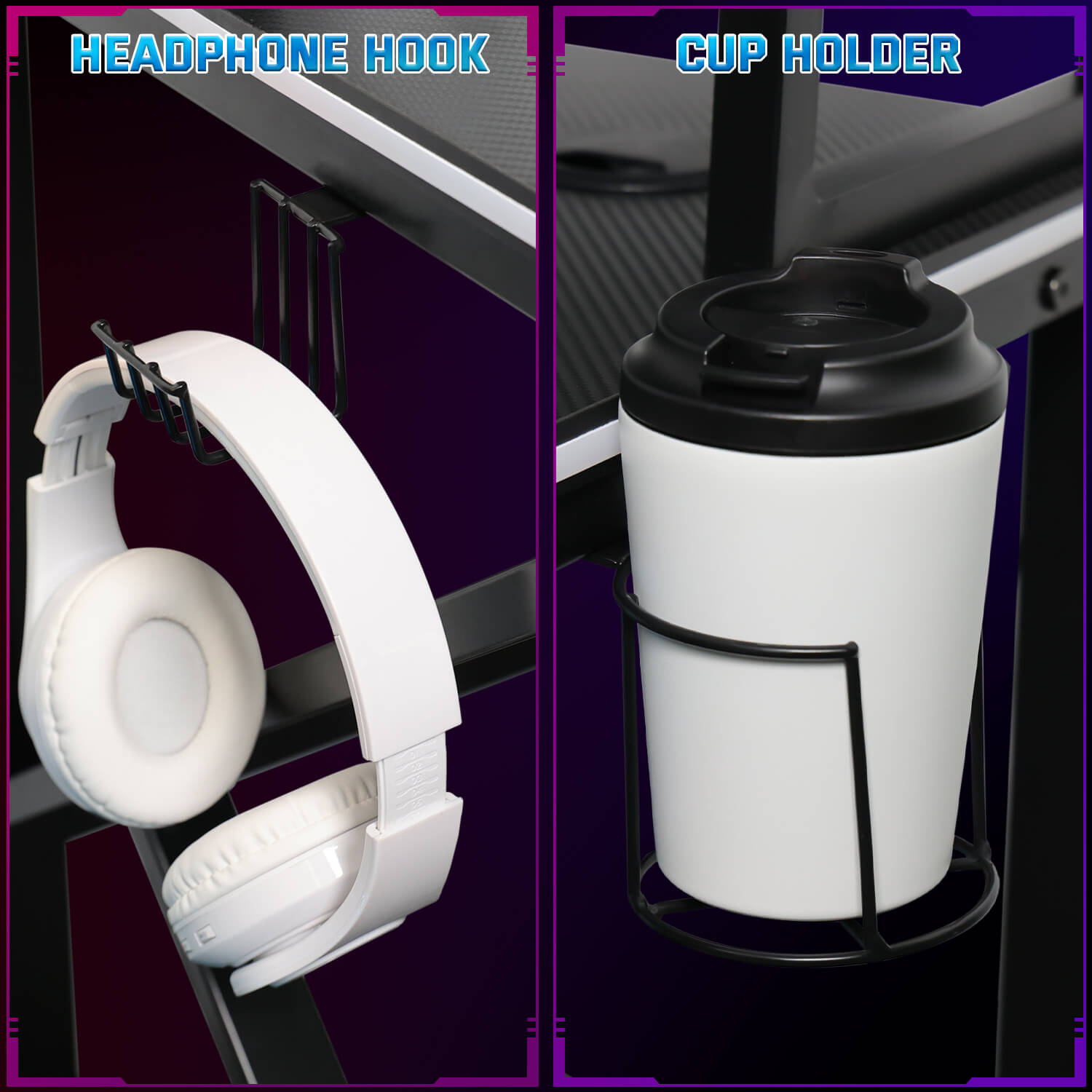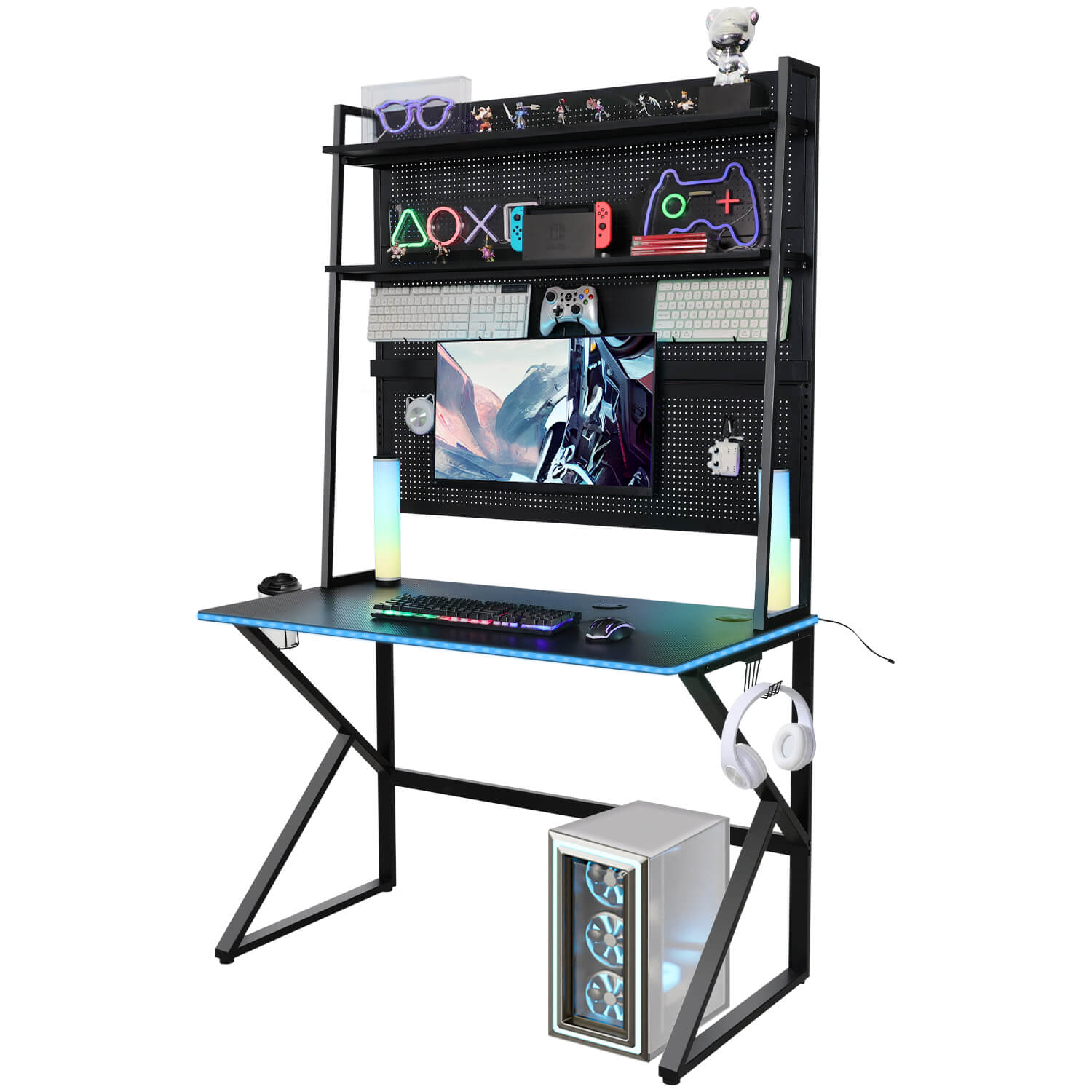 Craft your ideal gaming station with our ergonomic desk featuring LED lights, storage shelf, pegboard, monitor stand, headphone hook, and cup holder.