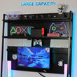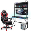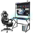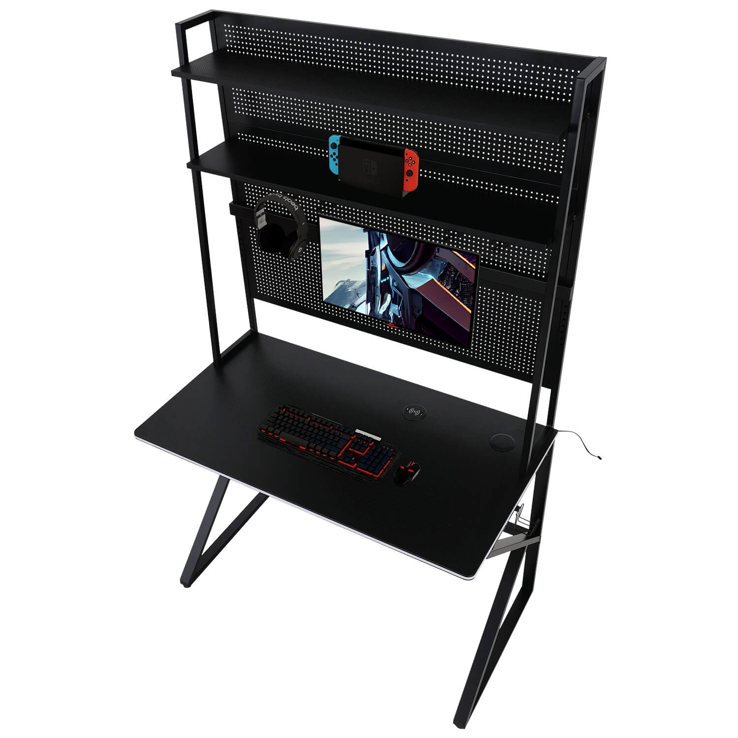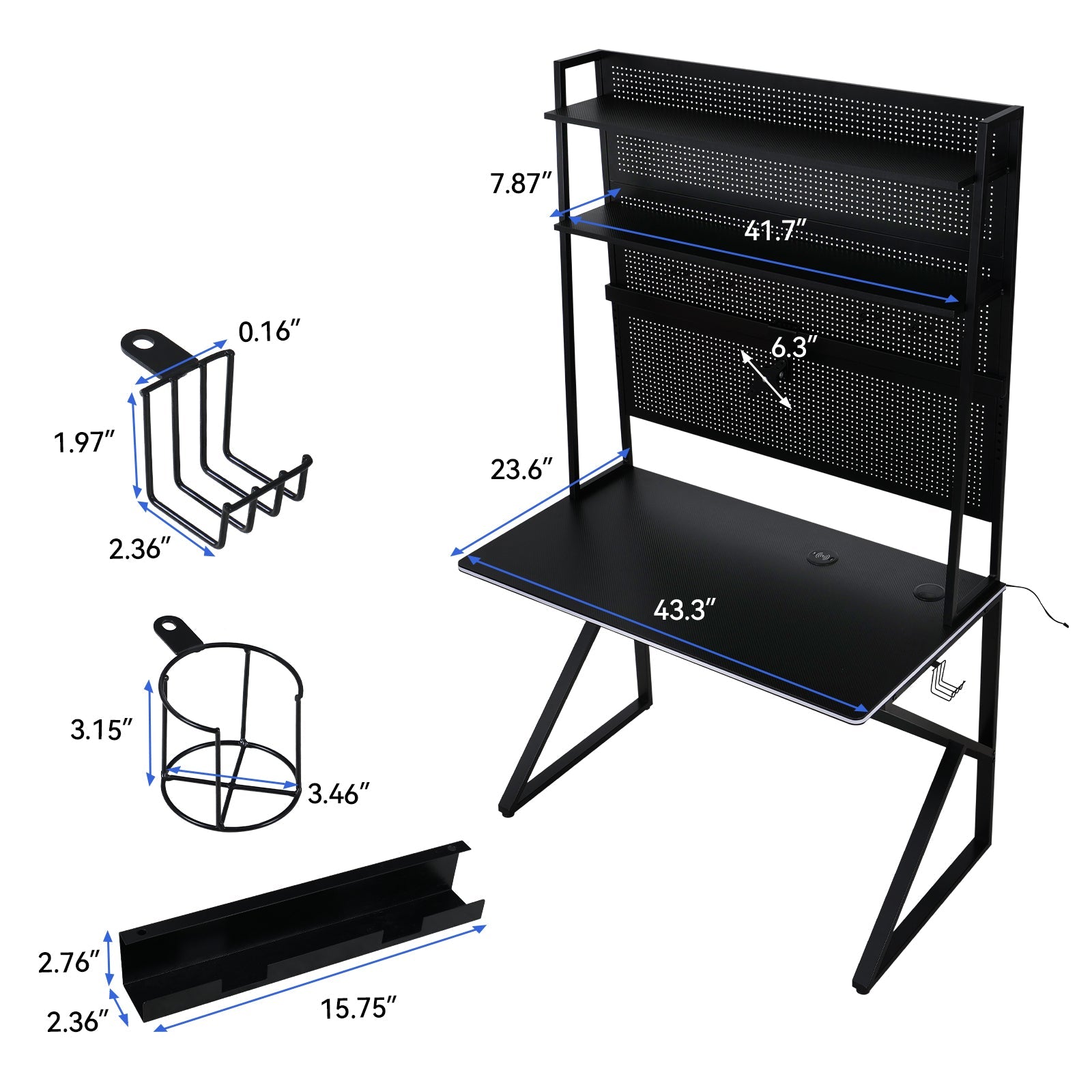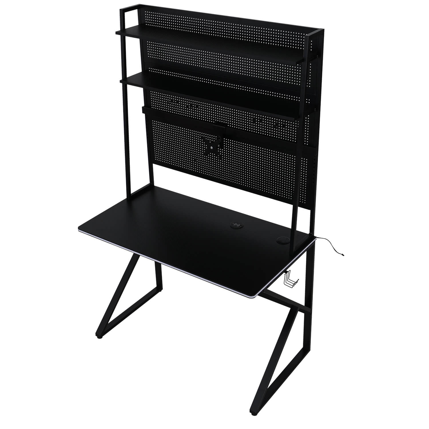 Craft your ideal gaming station with our ergonomic desk featuring LED lights, storage shelf, pegboard, monitor stand, headphone hook, and cup holder.