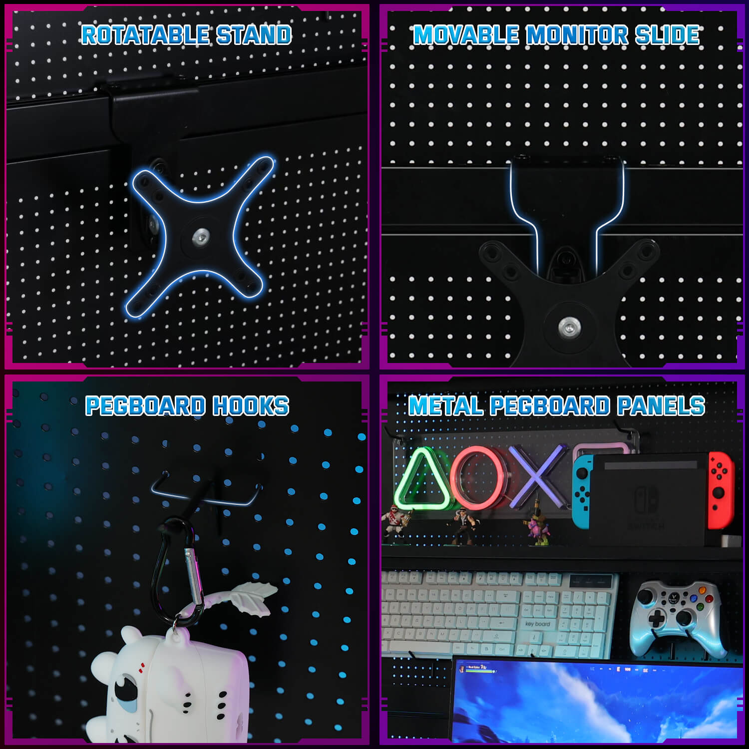 Seize control with the versatile pegboard. Personalize, display small items, and keep gaming gear within reach.