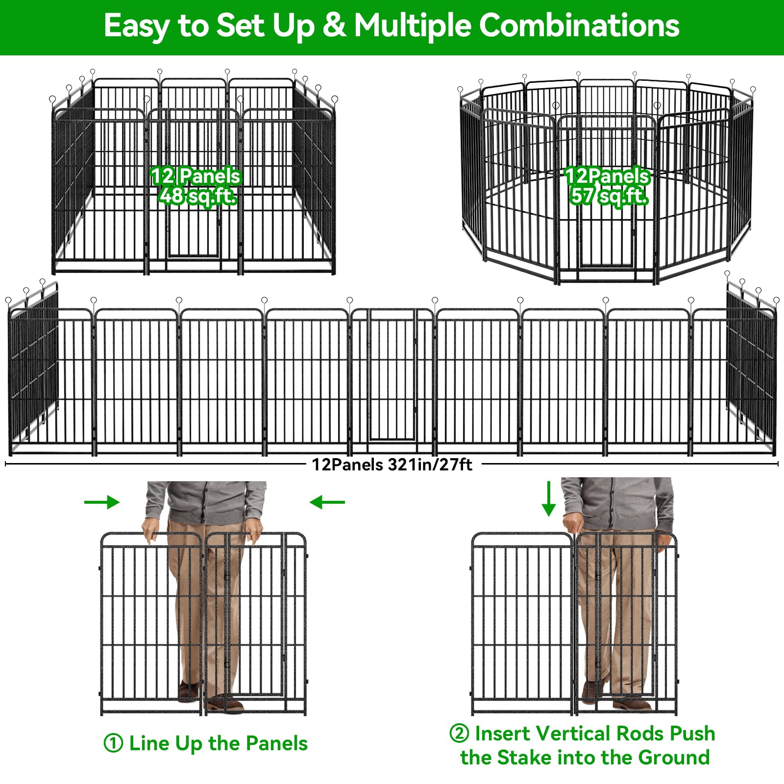 Heavy Duty Dog Playpen: 12 Steel Panels 47" Height, Square Steel Pipe with Reinforced Crossbars, 27FT 57 Sq.ft Portable Fence for Yard RV Camping, Snowy Black PDF8007