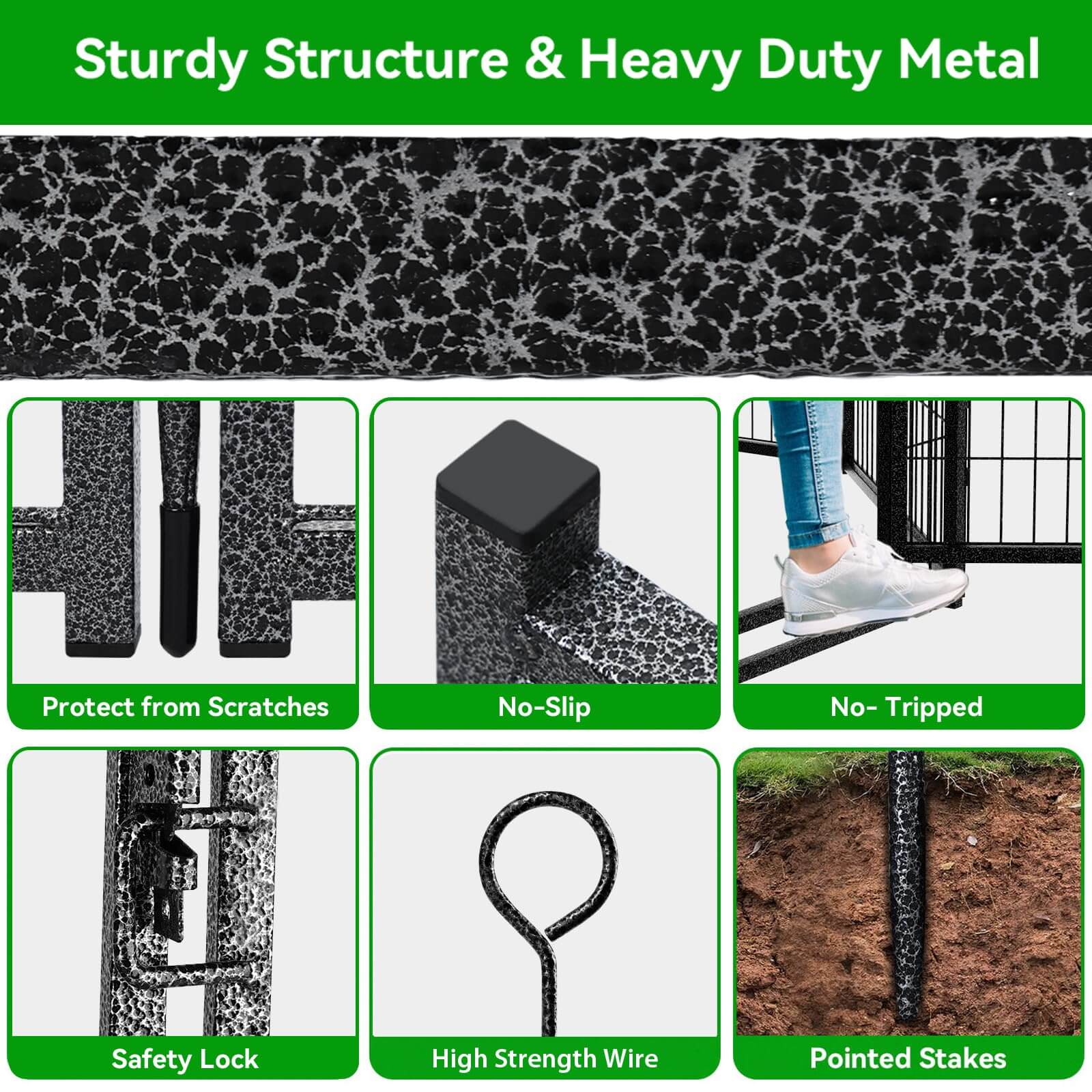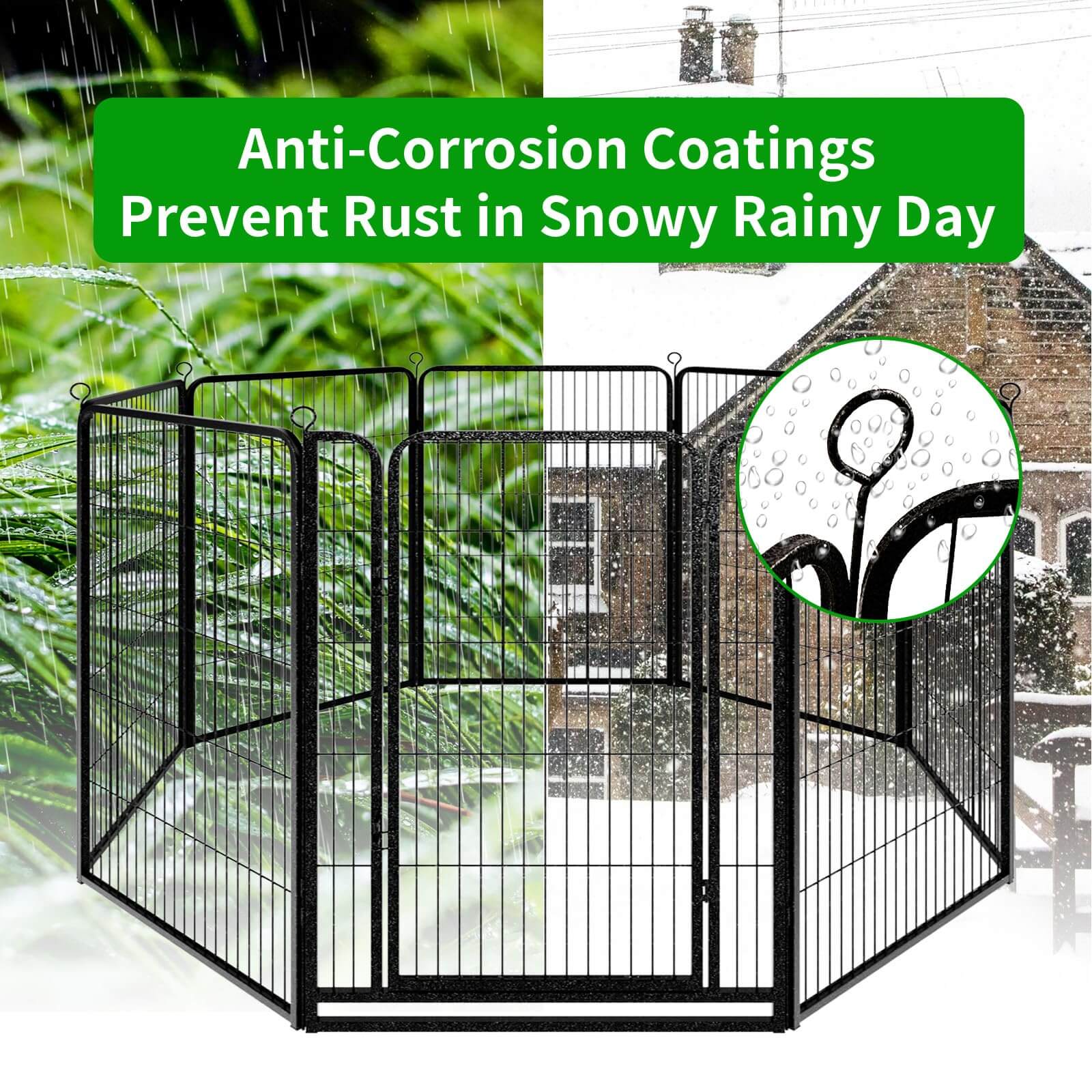 - đ¶ăAnti-Rust Coatings Materială This puppy playpen made of heavy-duty metal, sturdy and durable, steel wire smooth and solid, pet dogs couldn't damage or chew it, anti-corrosion coatings and rust-proof process helps panels works well outdoor and extend its life, the indoor and outdoor dog pen great for people with dogs