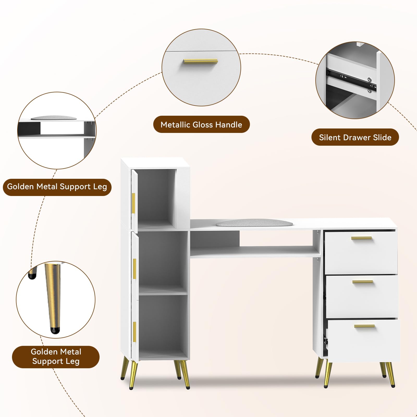 - High stability and low noise: Our white and large manicure Table nail station with drawer guides and soft-close hinges ensure smooth and silent movement