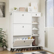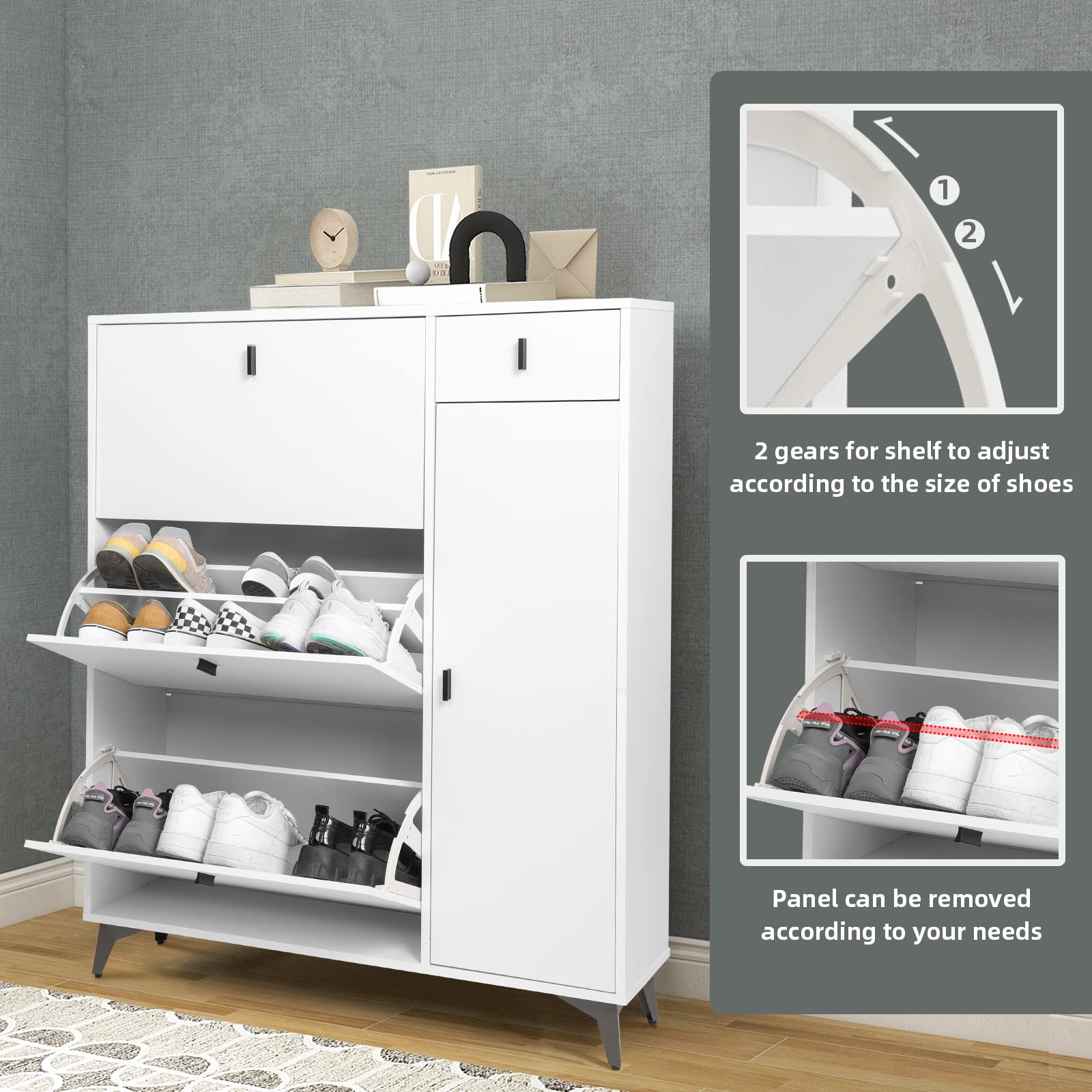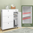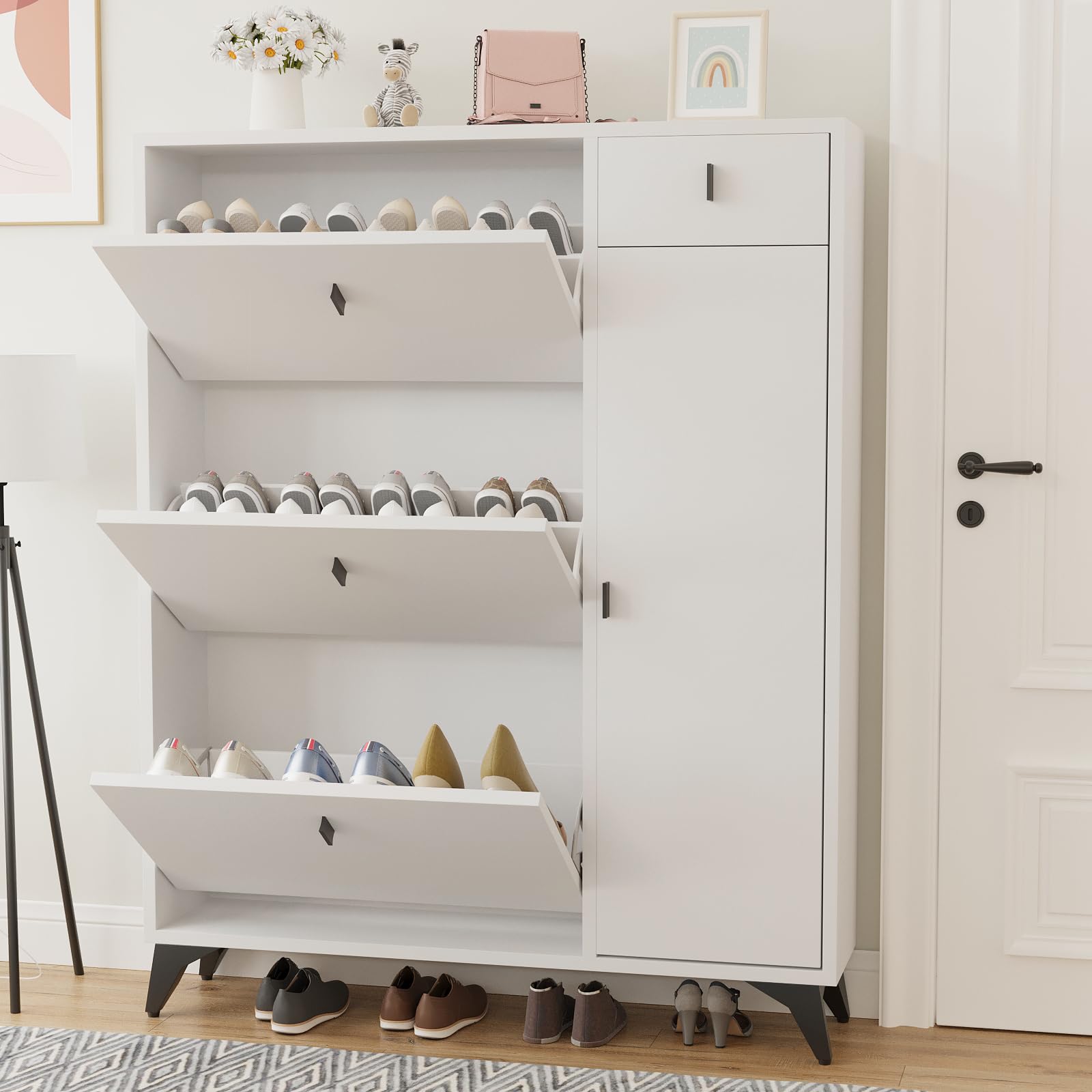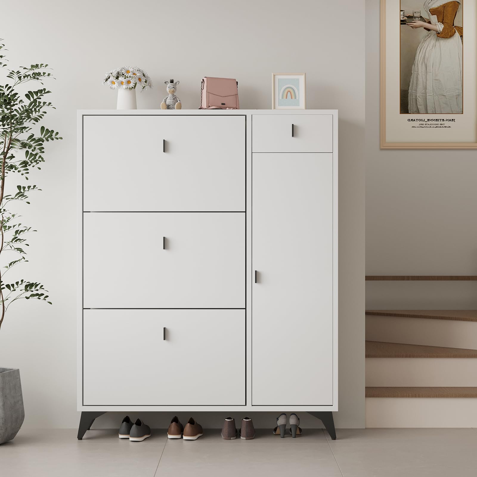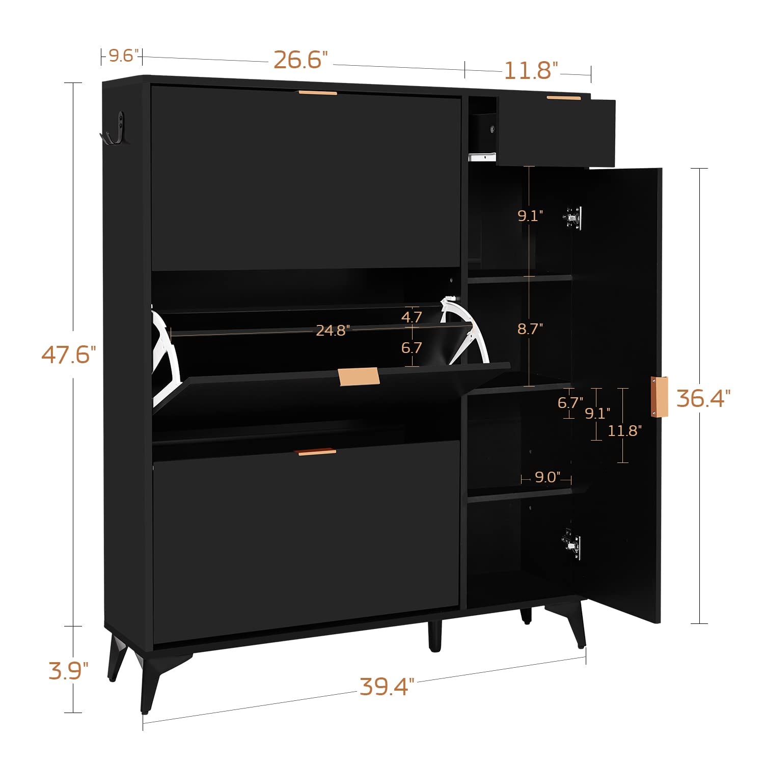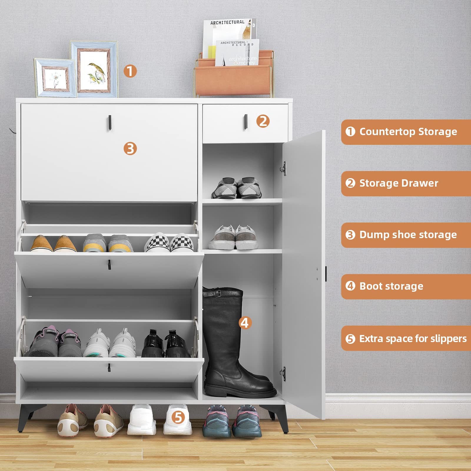 - 【Ample Storage Space】: With 3 flip drawers and side cabinets, the shoe organizer cabinet can store up to 22 pairs of shoes. And there are hooks on the side to hang umbrellas.