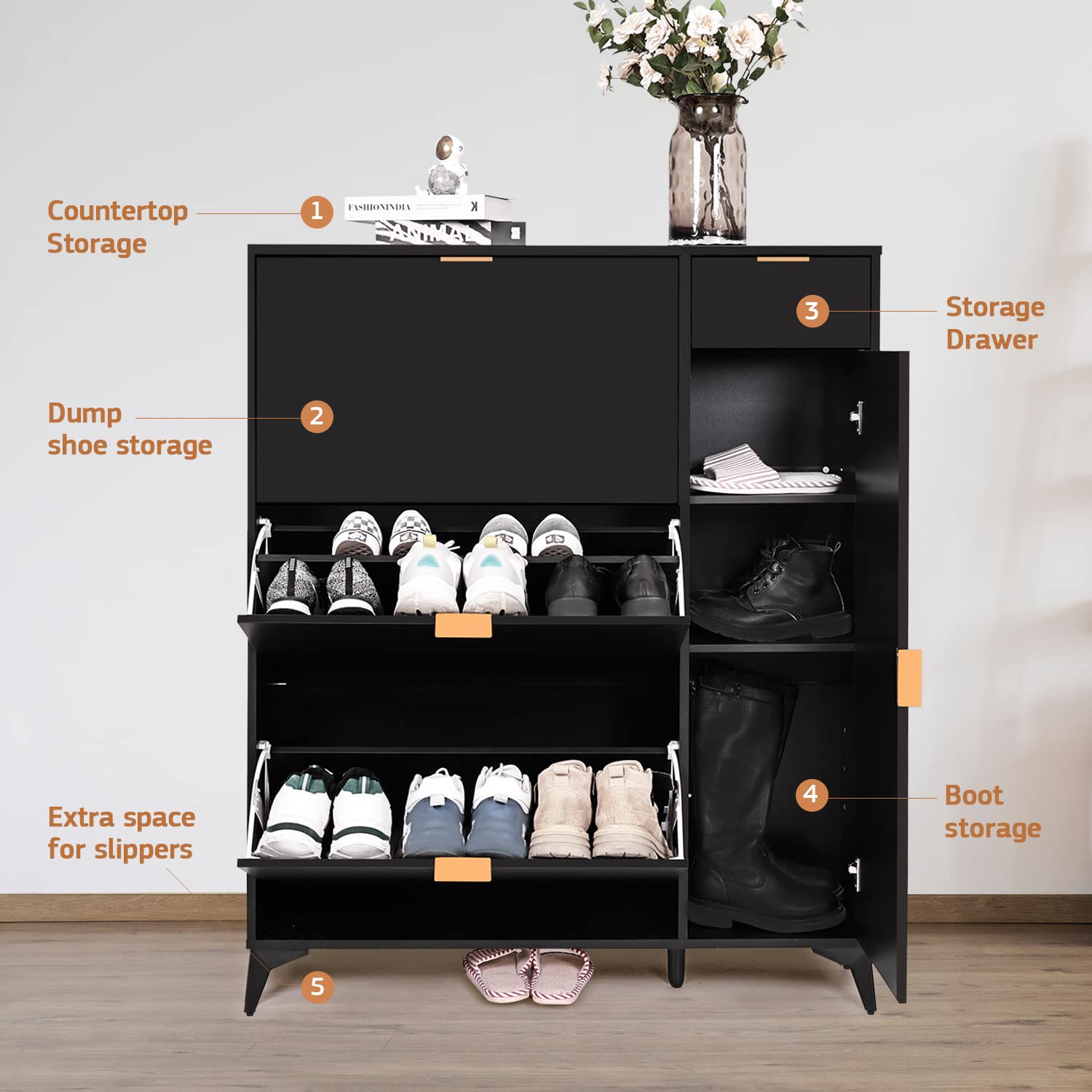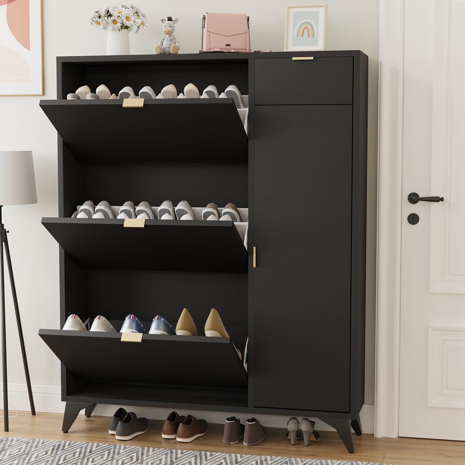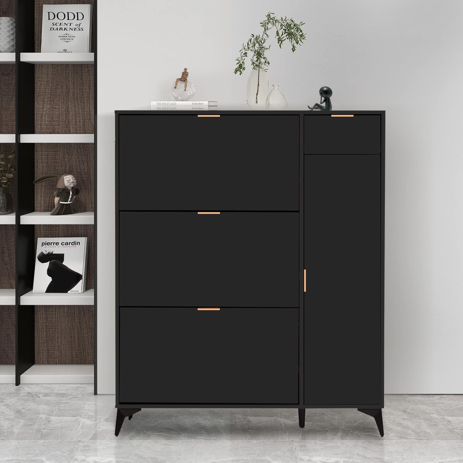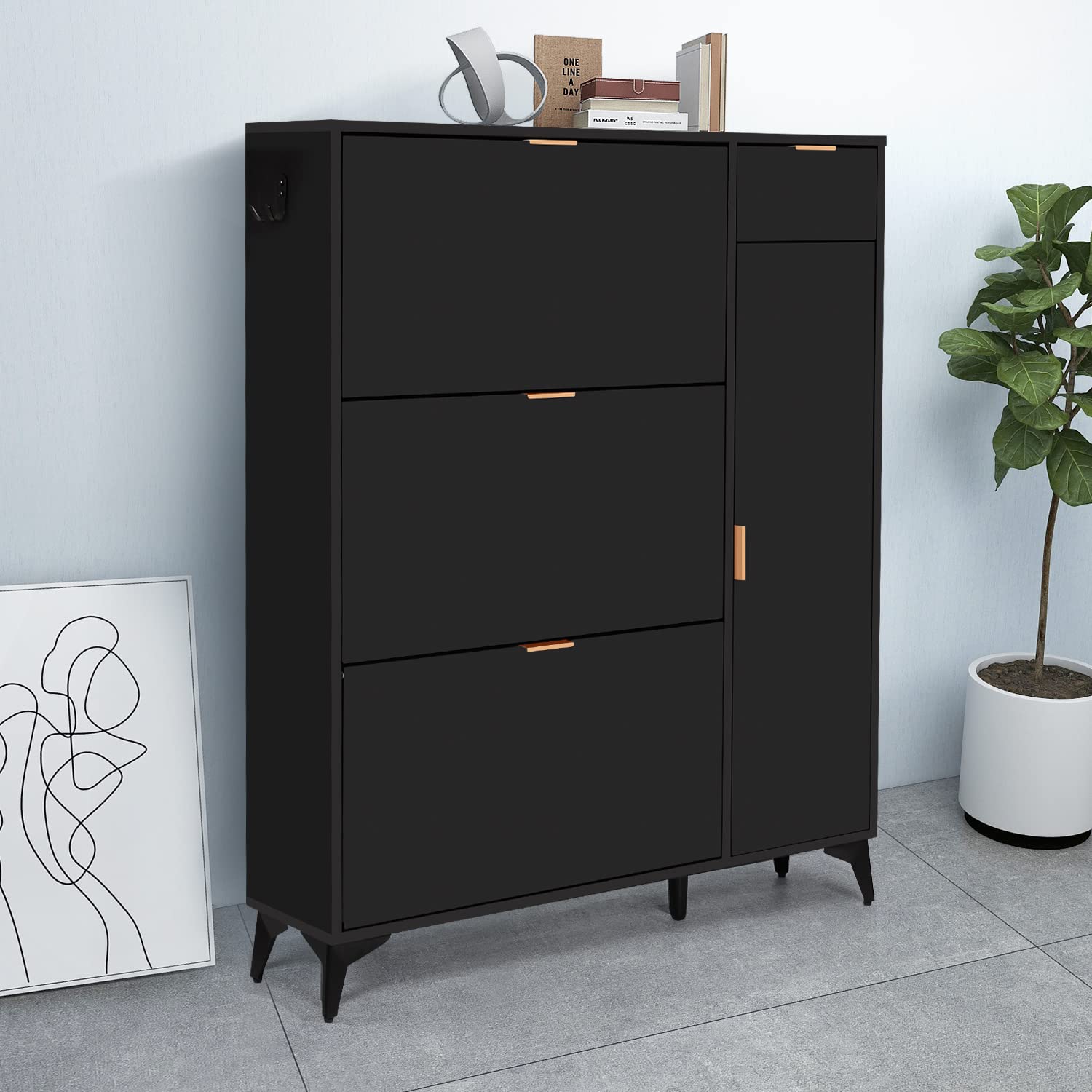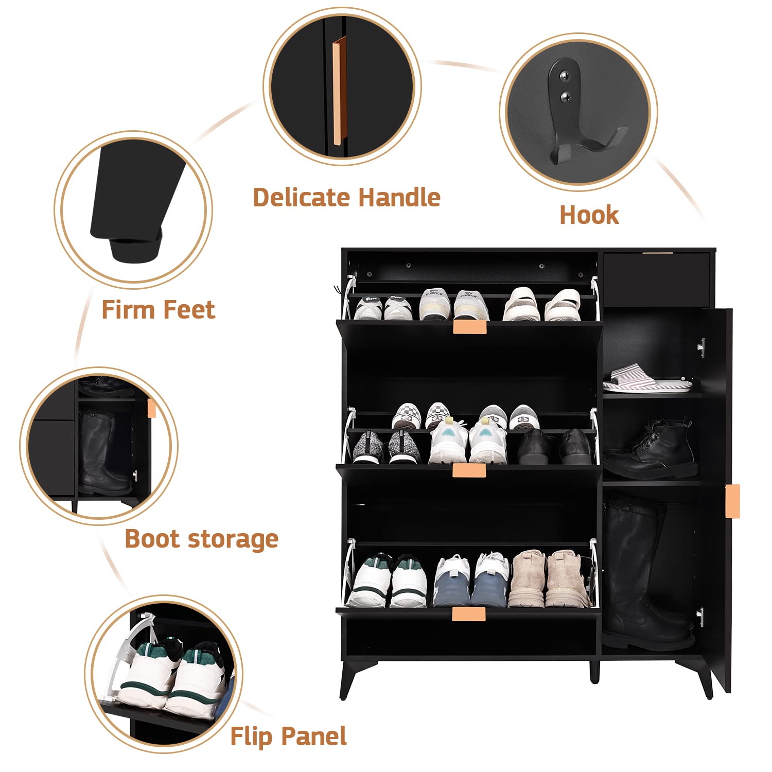 Slim Shoe Storage Cabinet with Door Black Narrow Shoes Organizer with 3 Flip Drawers Boot Rack for Entryway 22 Pairs IF004