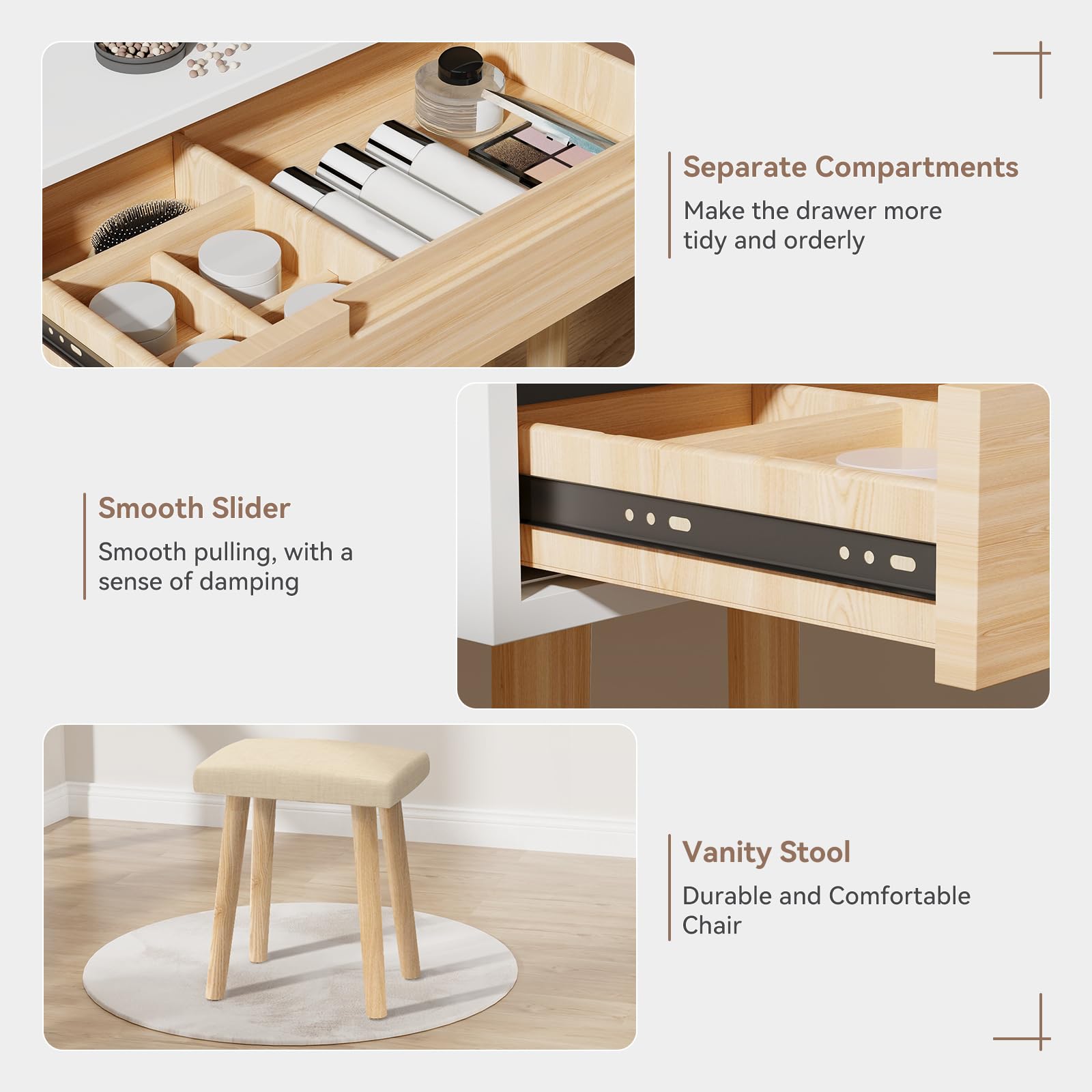 - Sturdy & Durable: A solid wood material compact makeup table is more durable. The tiny vanity table for a small space comes with a soft cushioned stool that allows you to sit comfortably when doing makeup