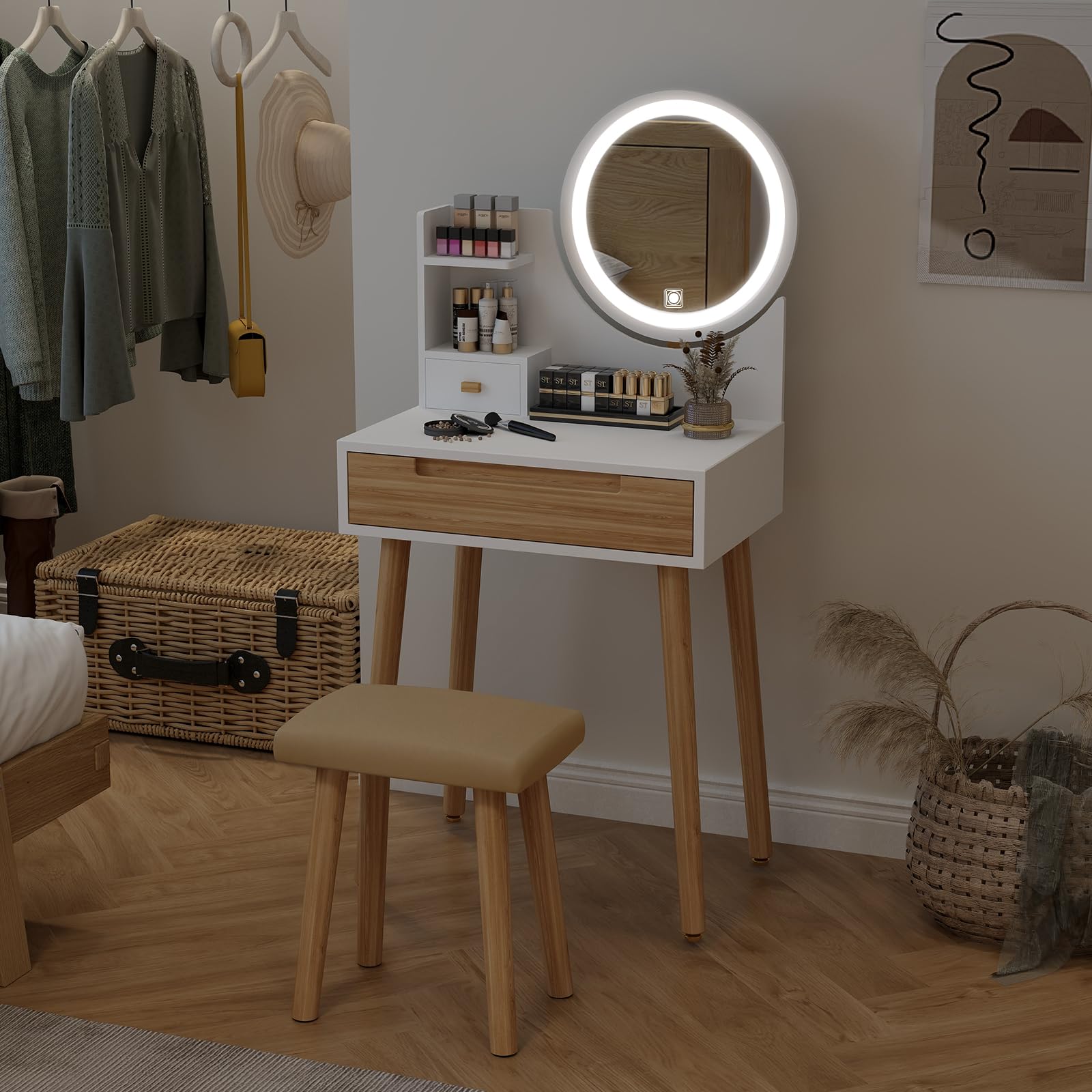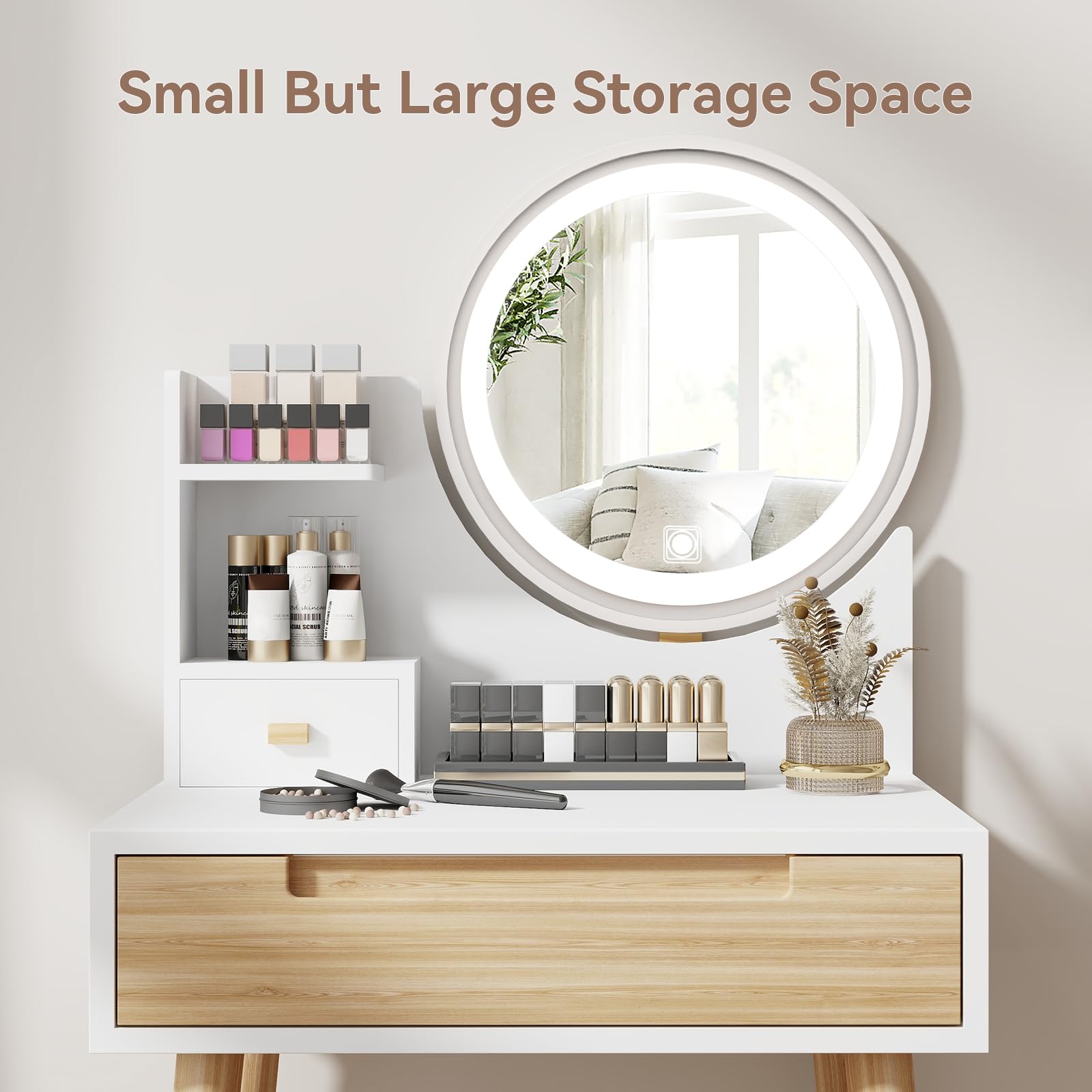 - Small but Large Storage: This vanity table is perfect for a small bedroom. The table shelf, small drawer, and 1 large drawer give you enough space to store your items