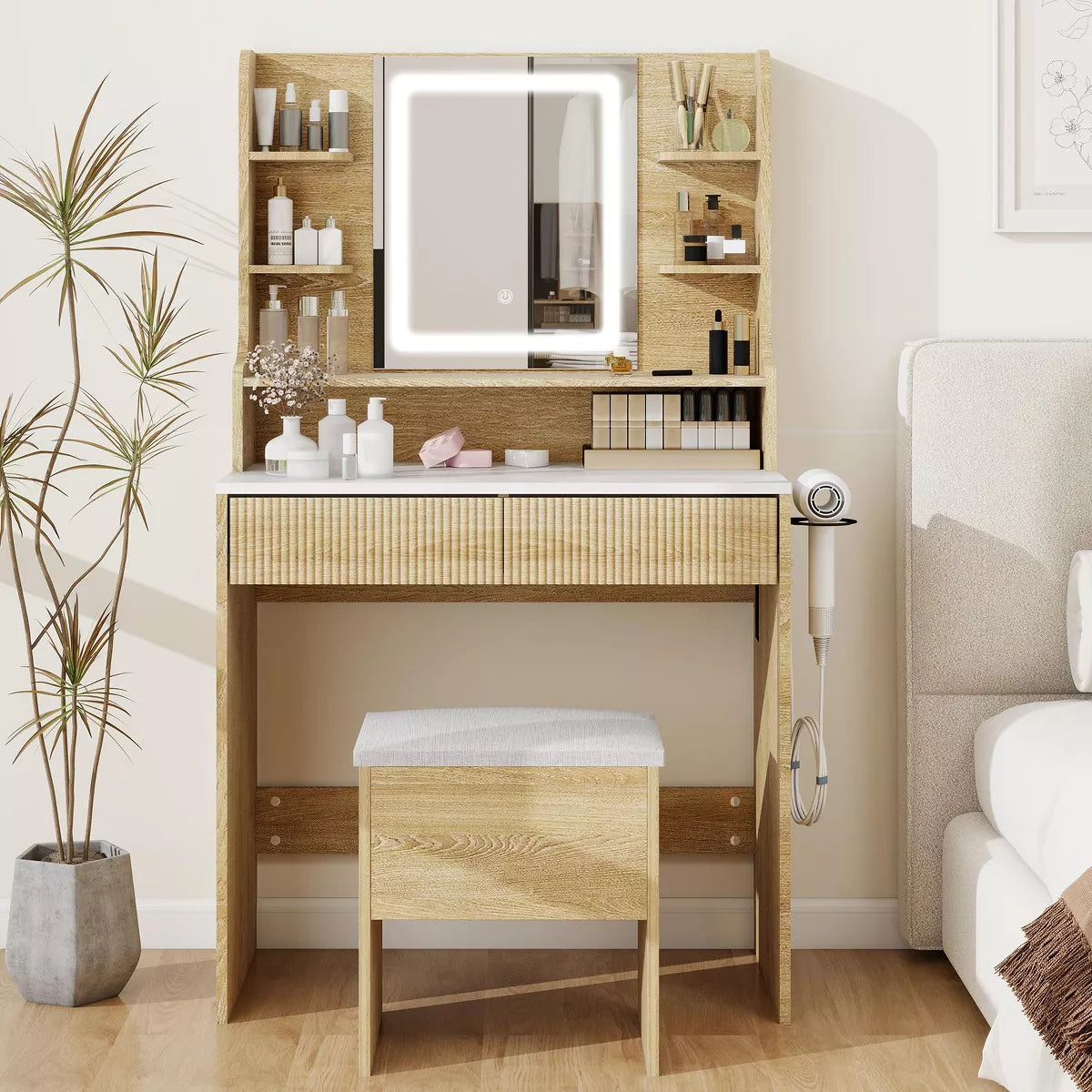 I am enamored with this vanity! It offers ample storage in both the dresser and seat compartments. The mirror's adaptability to various lighting conditions makes it a versatile addition. Its elegant design seamlessly complements the ambiance of my room, blending style with practicality. The drawers glide effortlessly, and the compartments are perfectly suited for organizing makeup essentials.
