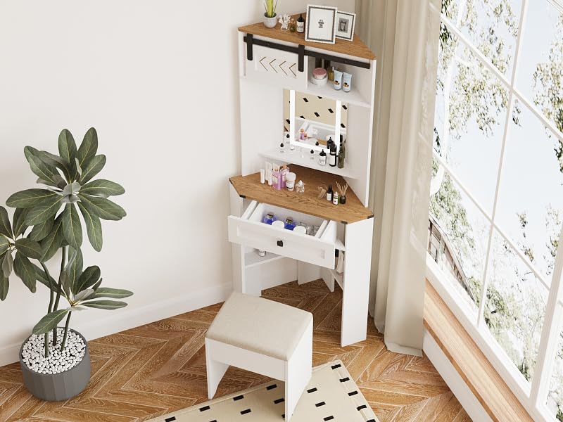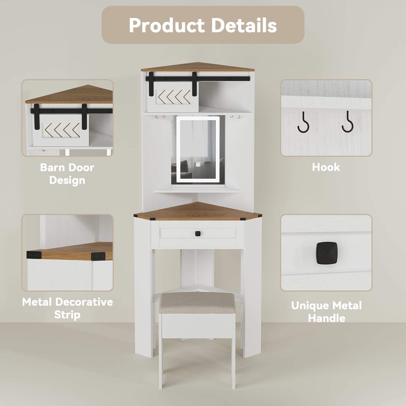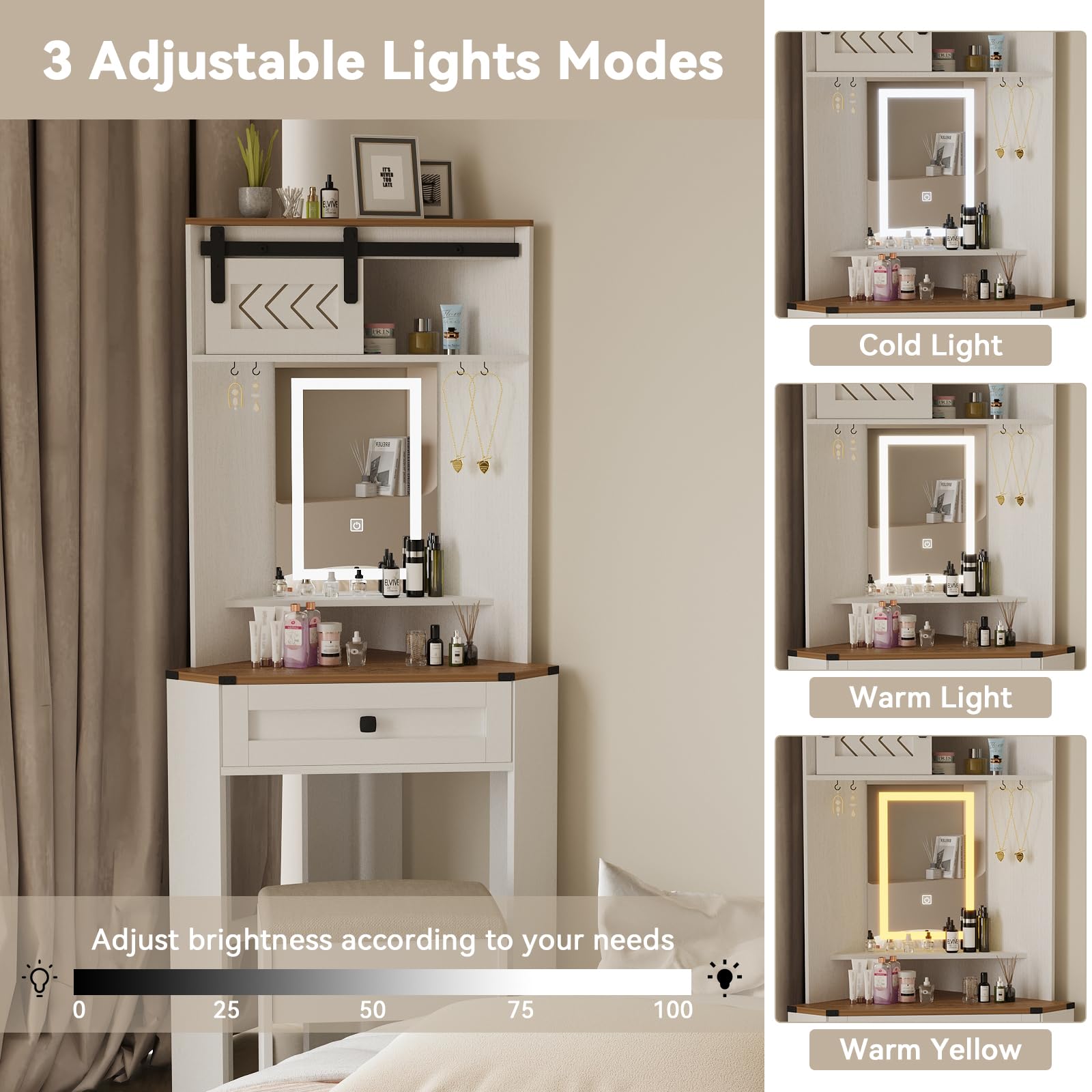 Small Makeup Vanity Desk Set with Mirror and Lights Corner Makeup Vanity Set with Drawers for Compact Space Farmhouse White Make up Dressing Table with Storage Stool for Bedroom IF056