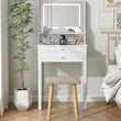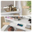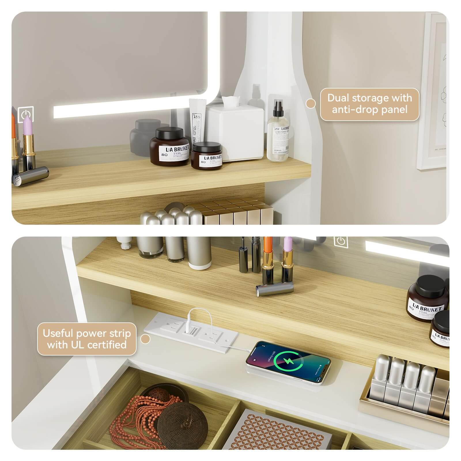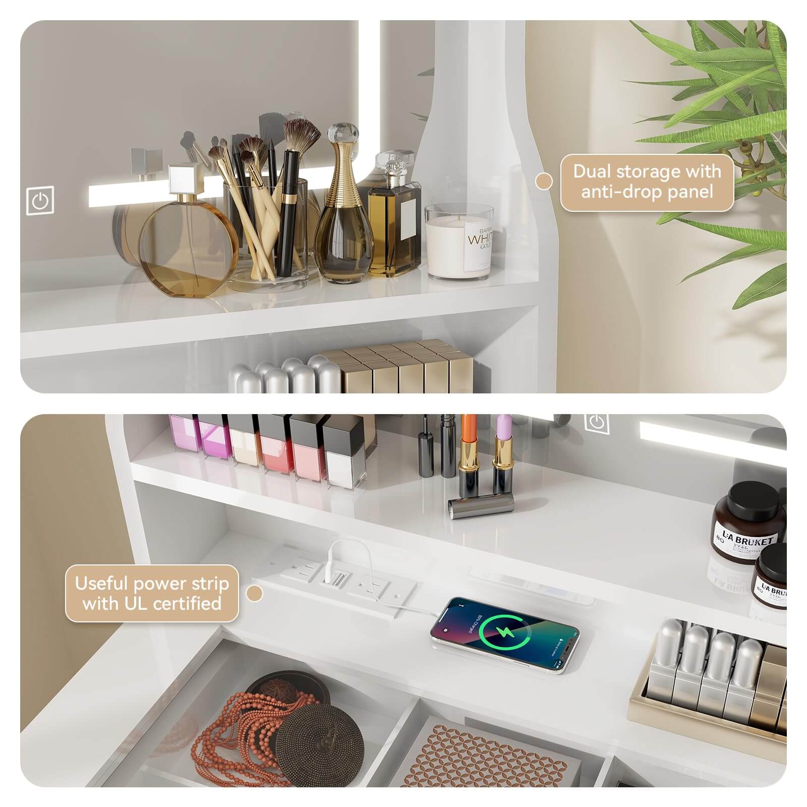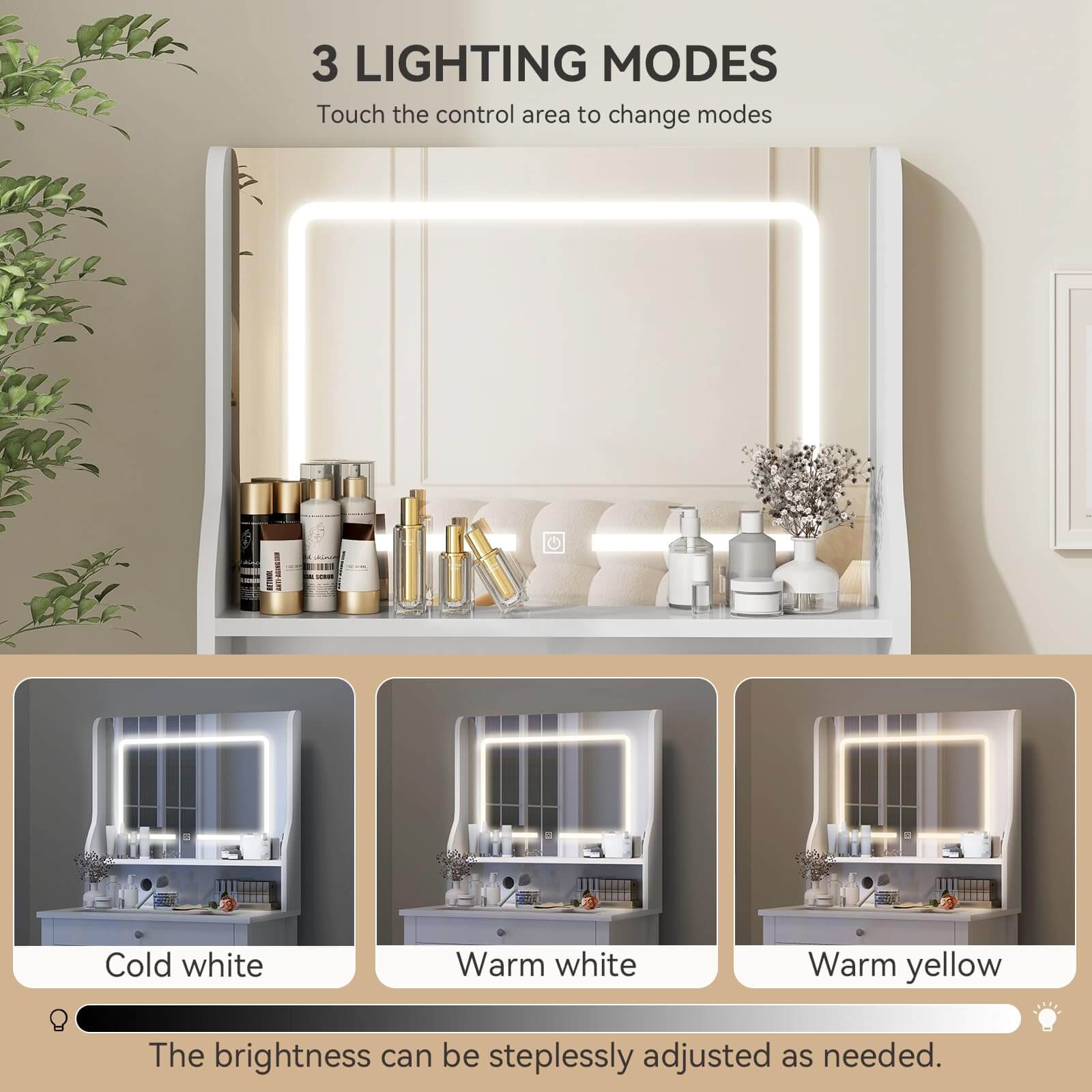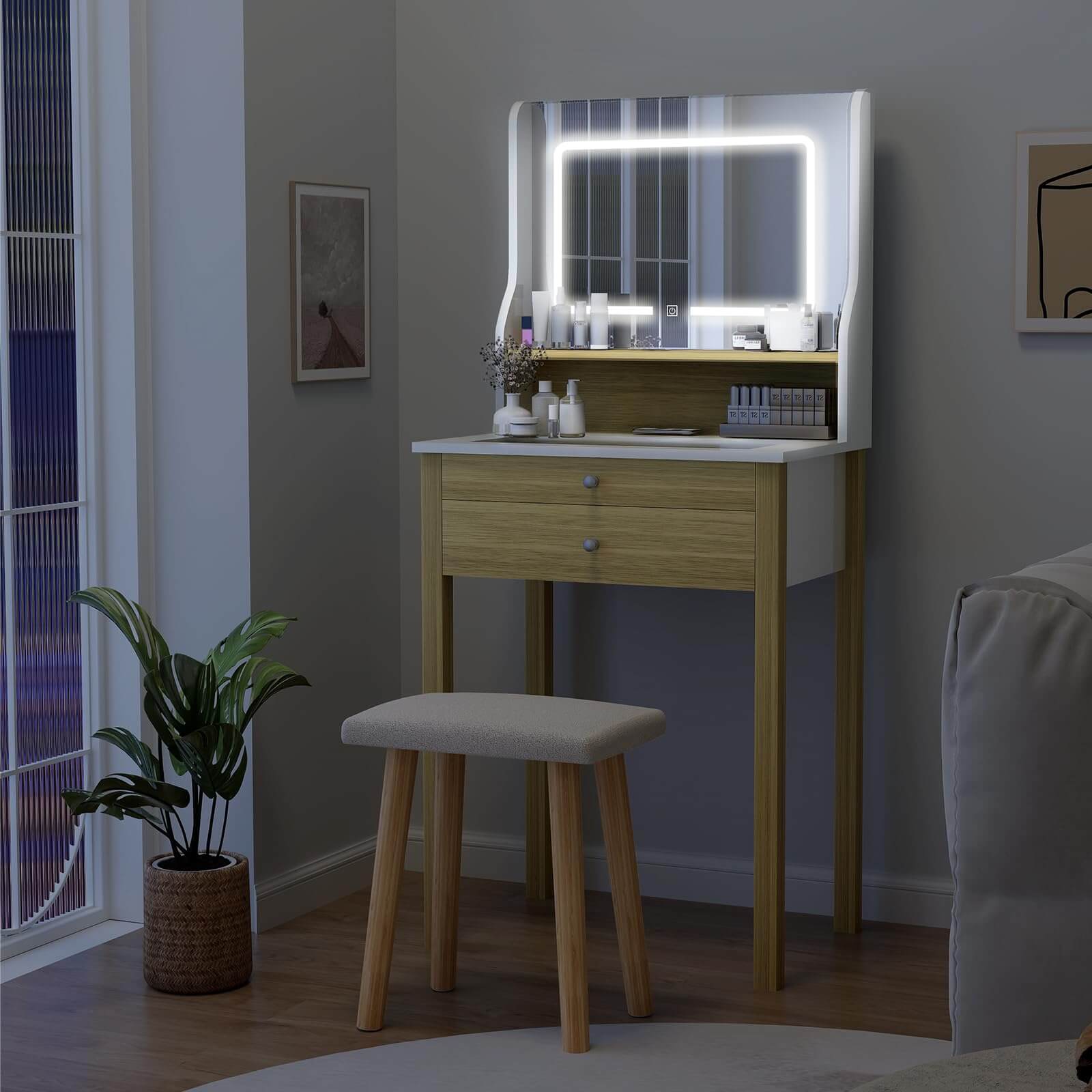 - Vanity Desk with Mirror and Light: This makeup vanity install the LED lamp around the mirror which can switch natural light, warm light and cool light.Choosing different light according to different scenes and different makeup.