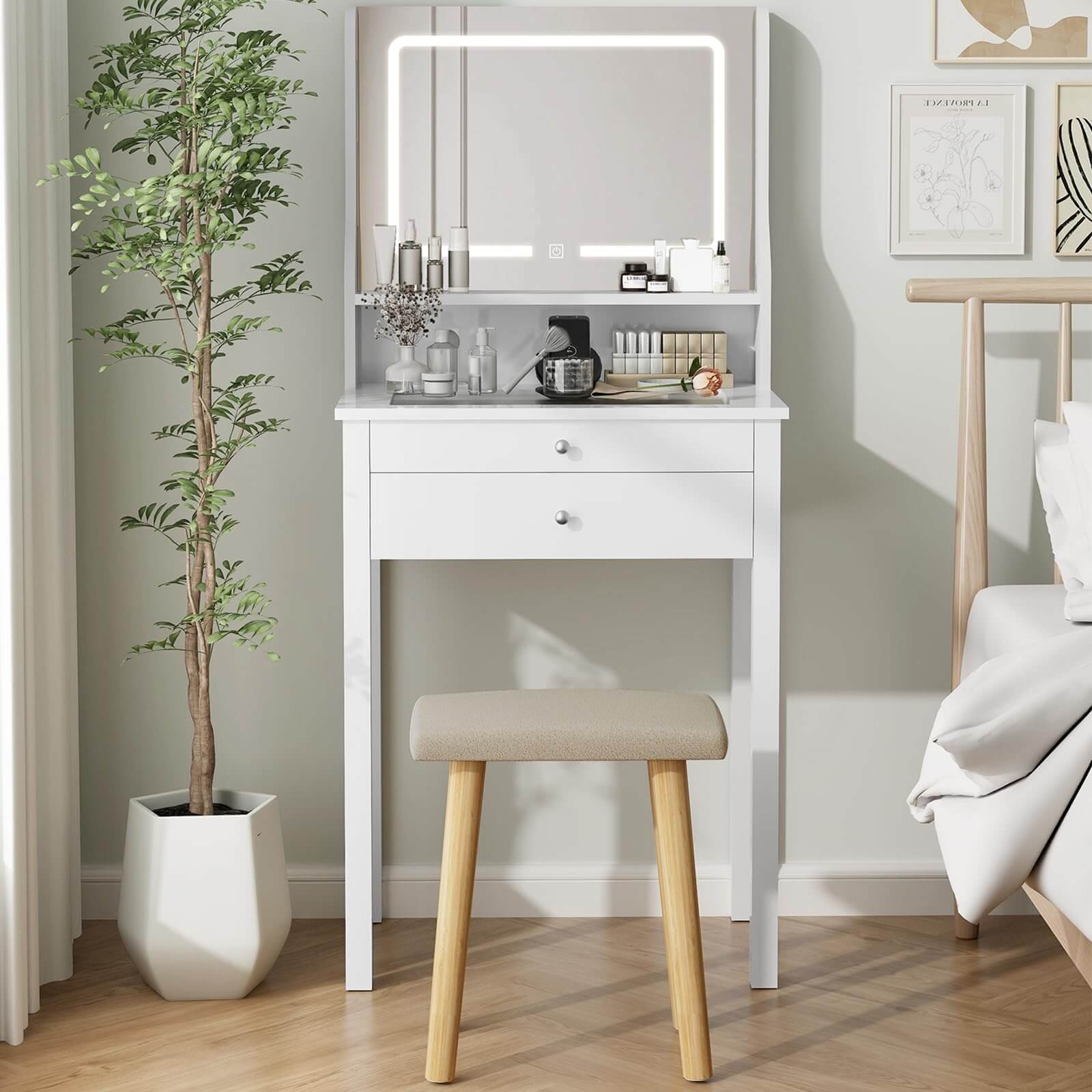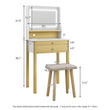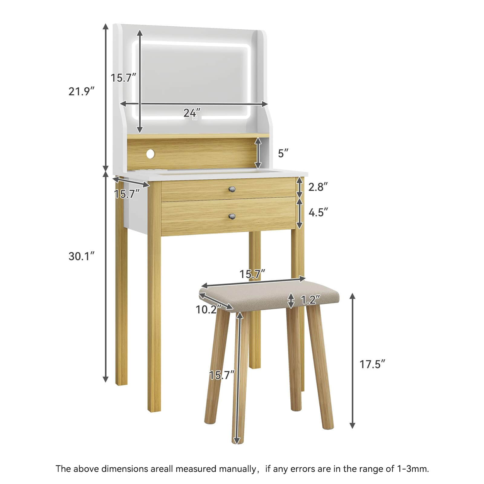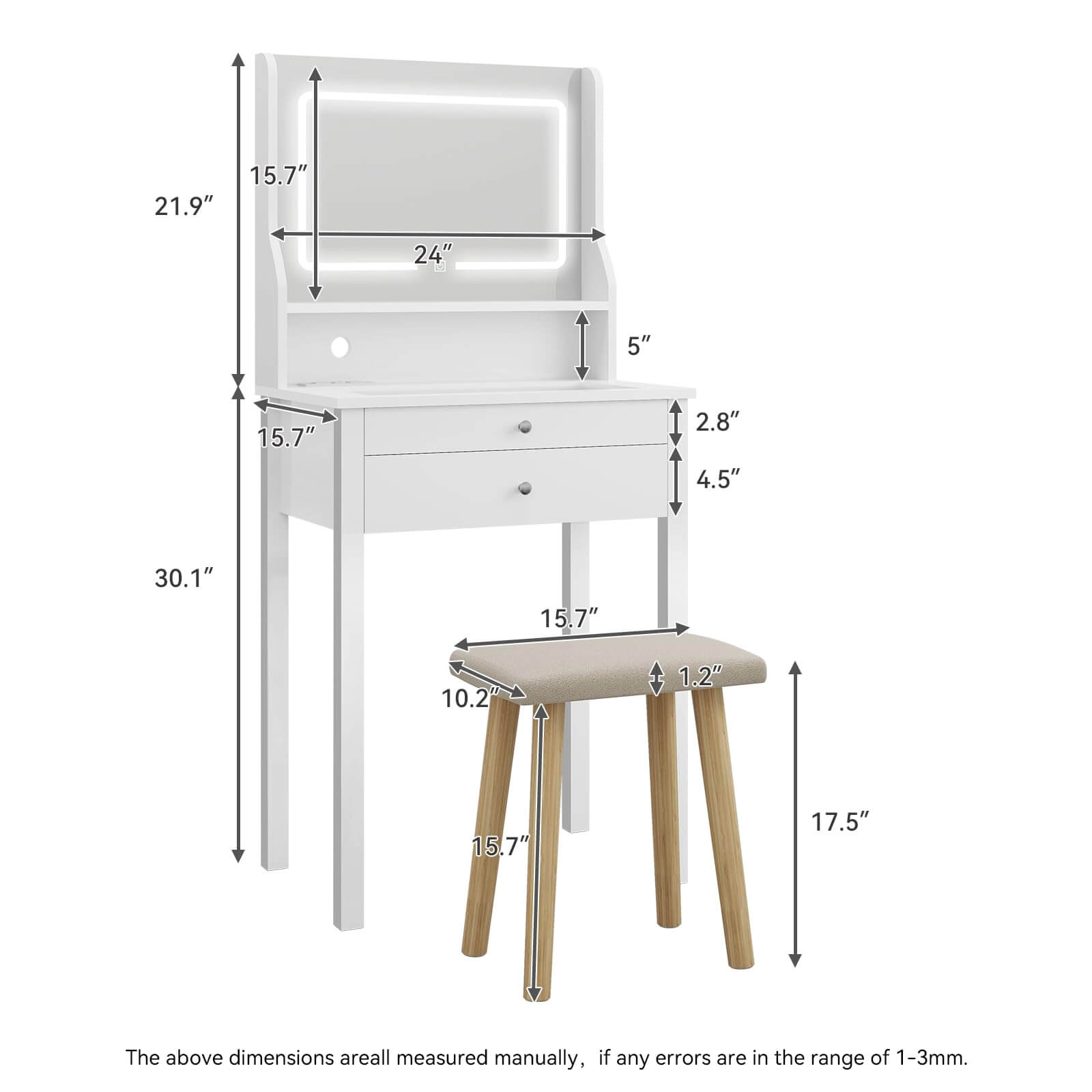 - Small Vanity for Small Space:Makeup vanity size:24*15.7*52”(L*W*H),Stool:15.7*10.2*17.5”(L*W*H).This size allows for less space needed for the makeup desk.Anti-tip Device behind the vanity , you can fix it on the wall for safety.