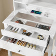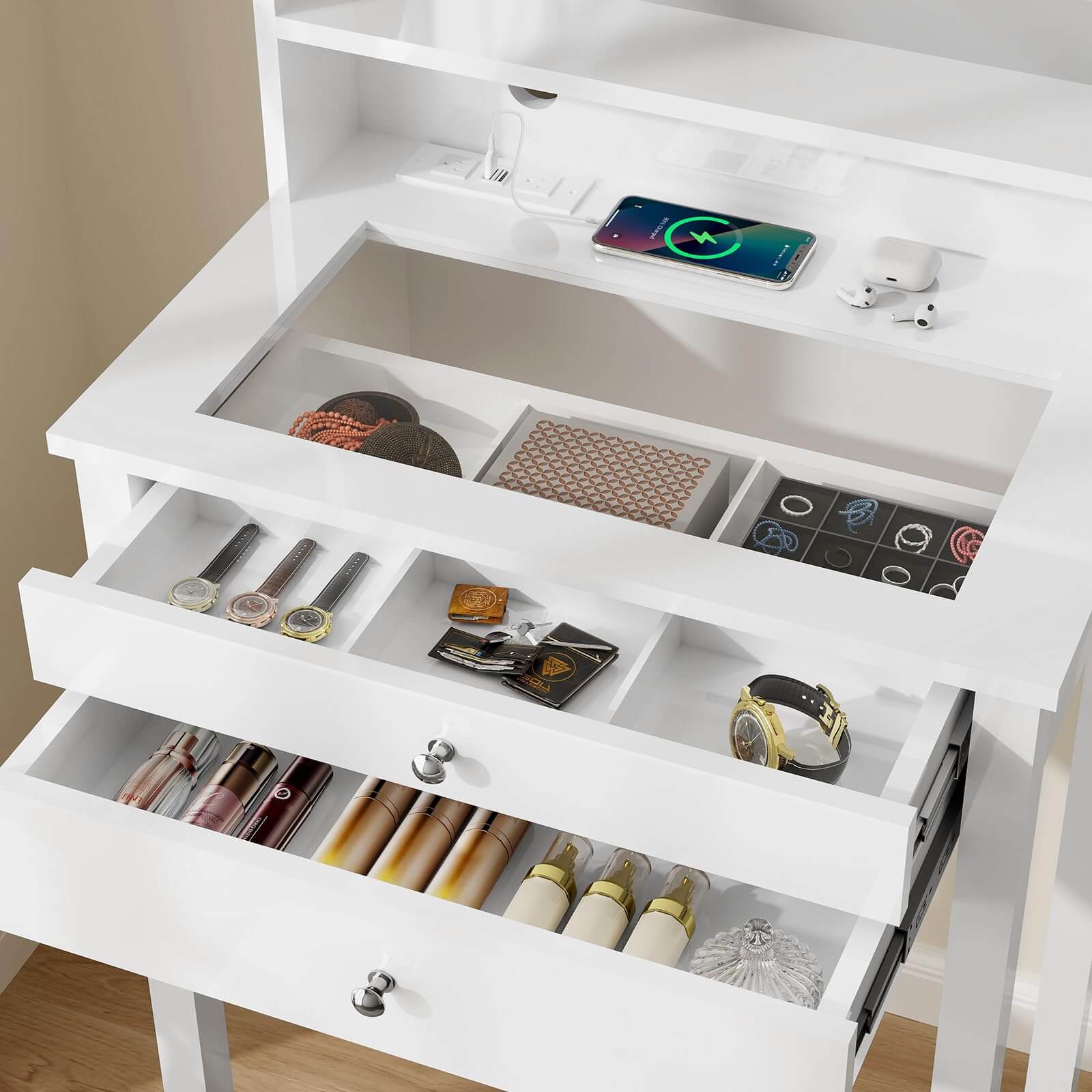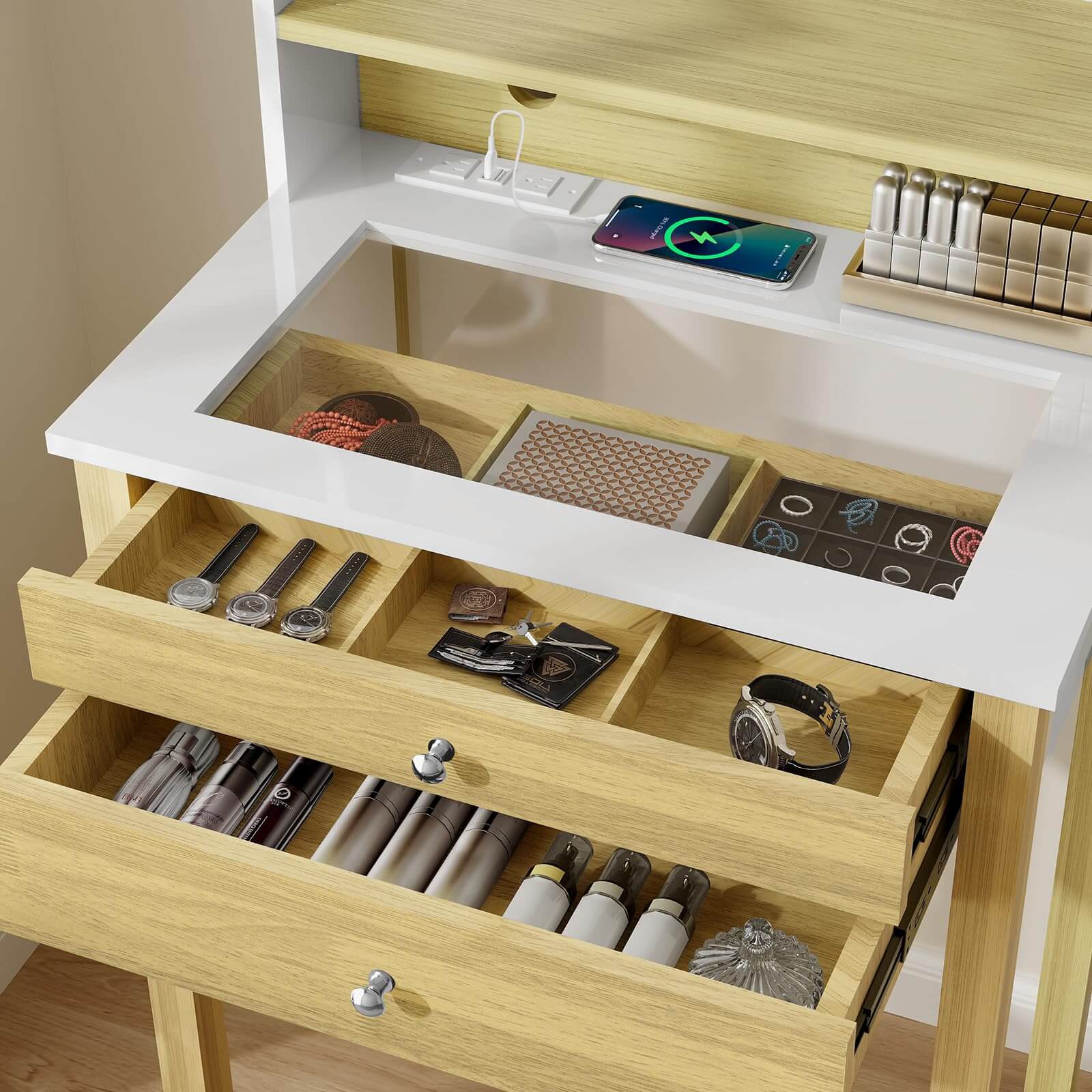 - Ample Storage Space:The top drawer of the double drawers has tiered dividers that make it easy to store different sizes of cosmetics or jewelry.The 8mm tempered glass tabletop allows for an unobstructed view of the drawer's contents.