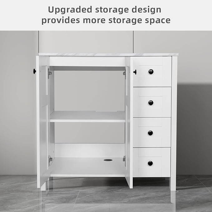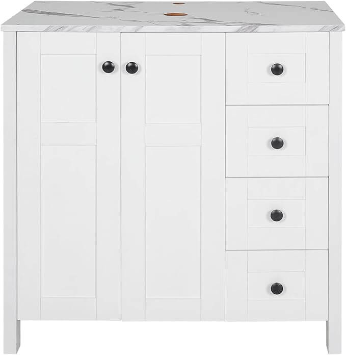 - 【Marble Pattern Countertop】The unique marble texture design of the countertop gives you timeless beauty and elegance. The simple white Bathroom Vanity color choice combined with the black zinc alloy round knobs brings you a pure but stylish feeling.