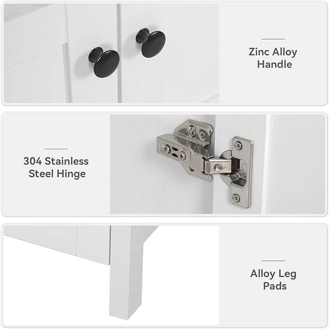 - 【Soft Close Door】Zinc alloy handles and 304 stainless steel hinges ensure the performance of the Bathroom Vanity. Rust-proof alloy leg pads further ensure durability. Soft-close door for better improves every user's experience. Open the cabinet without any slamming or jarring.